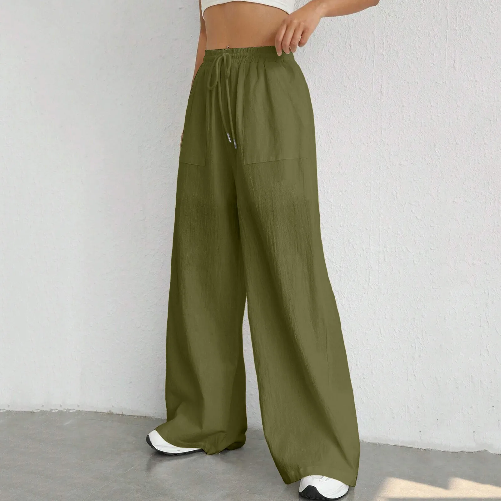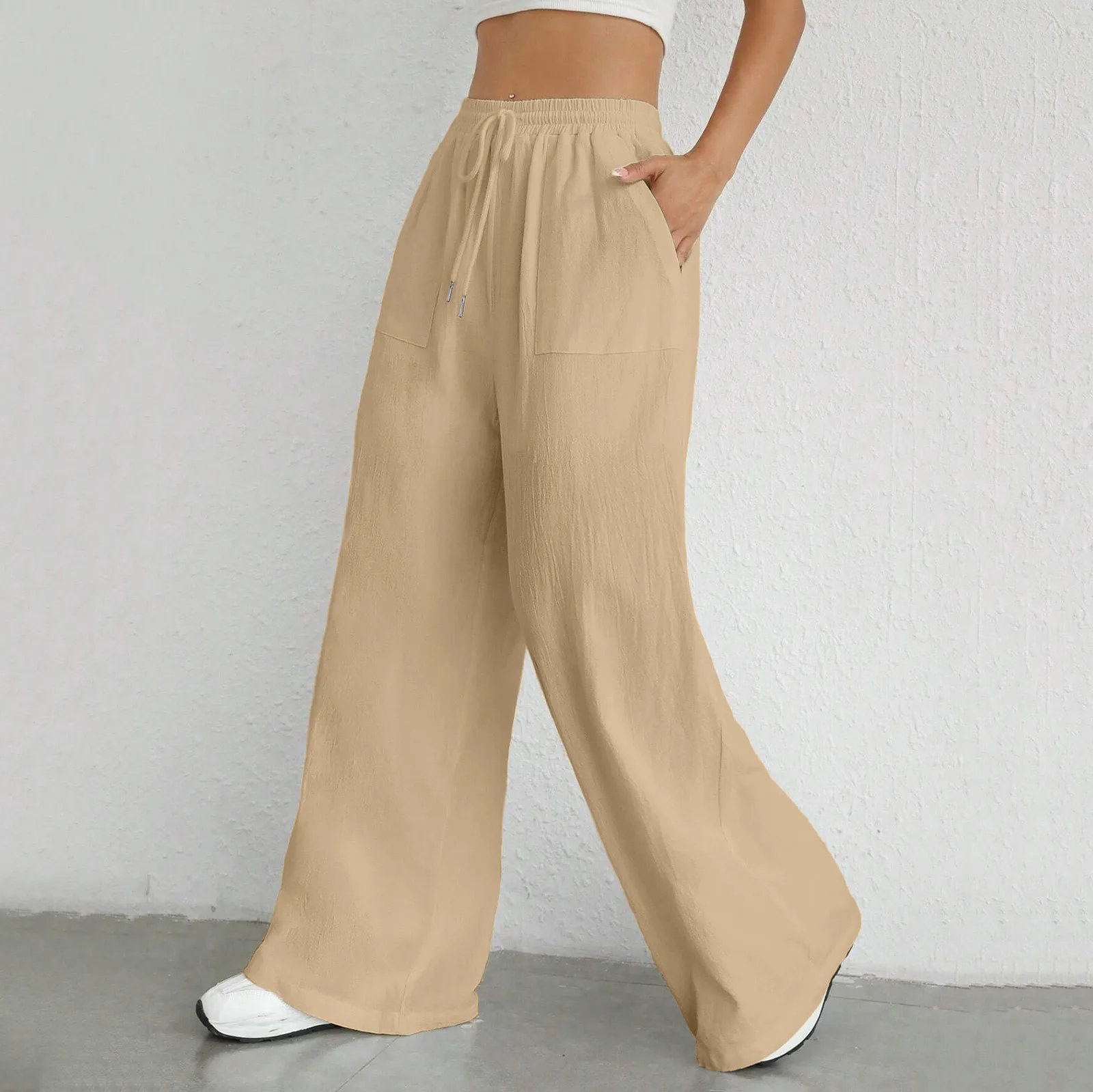 Women Summer Casual Pants High Waist Ice Silk Long Pants Solid Wide Leg Pocket Lace Up Sports Loose Black Pants Female Trousers