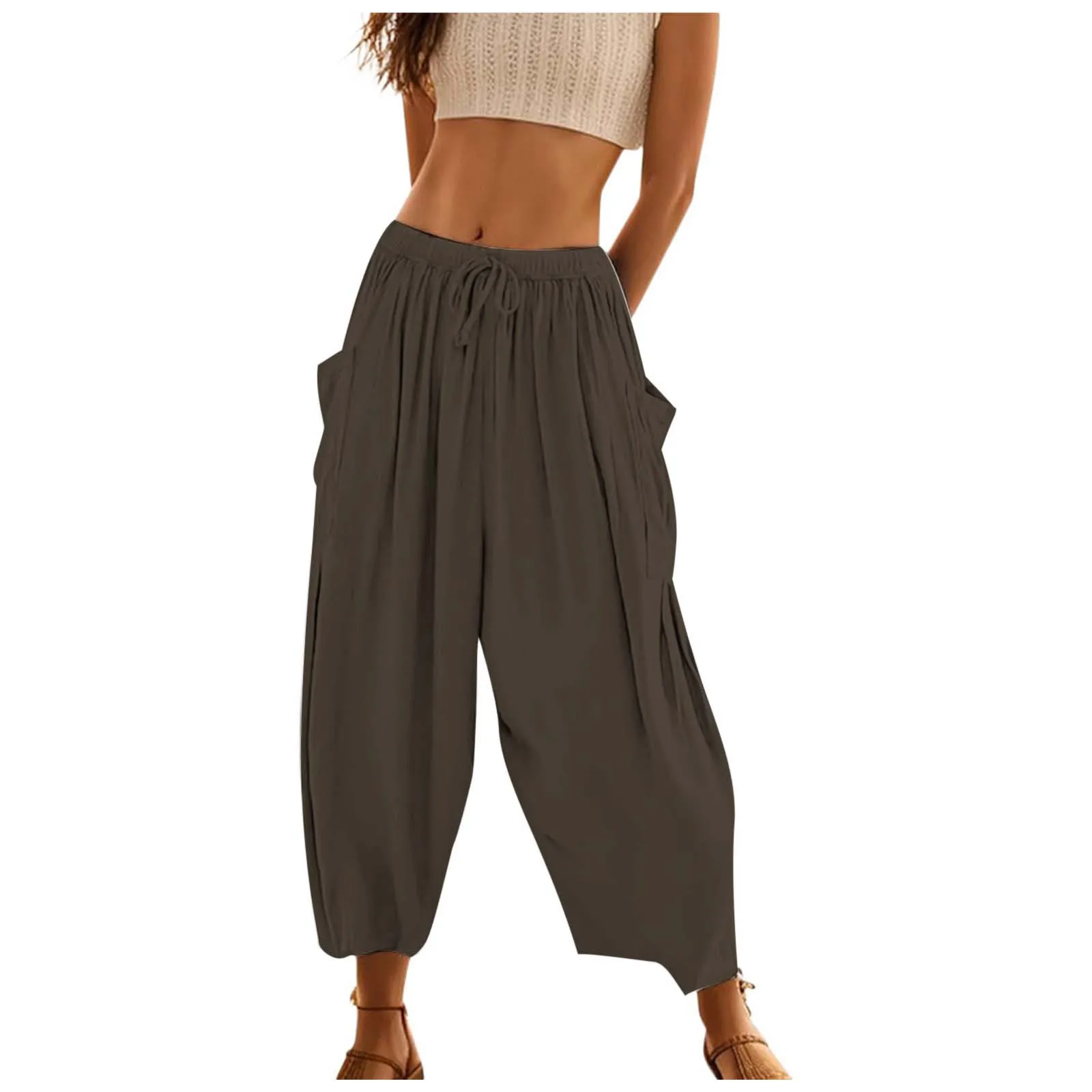 Women's Harem Pants Solid Color Cotton Linen Wide Leg Loose Low Waist Trousers Pocket Casual Outdoor Beach Holiday Female Pants