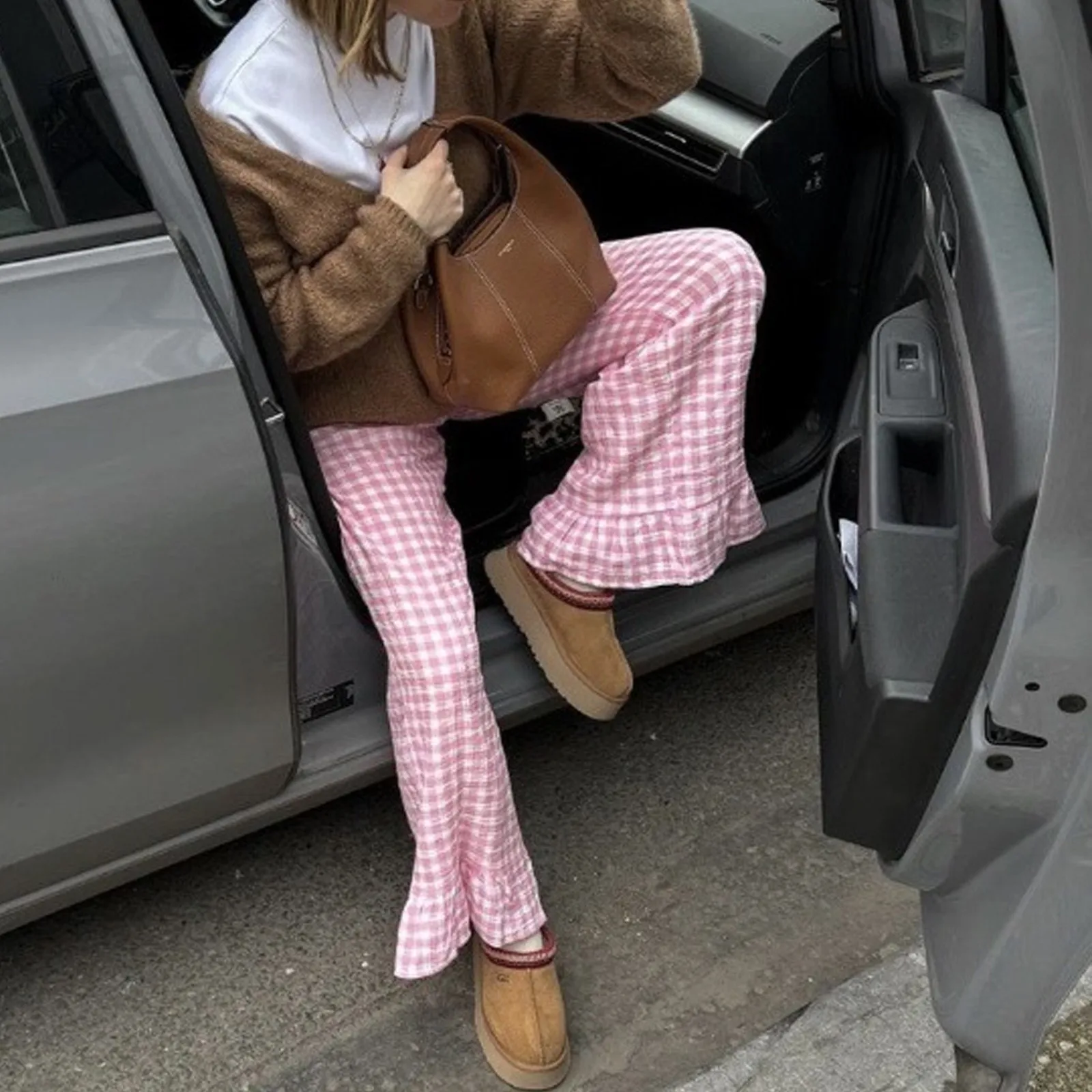 Casual Plaid Print Pants Women Loose Flared Elastic Wide Leg Trousers Female 2024 Summer Lady All-matching Streetwear Female