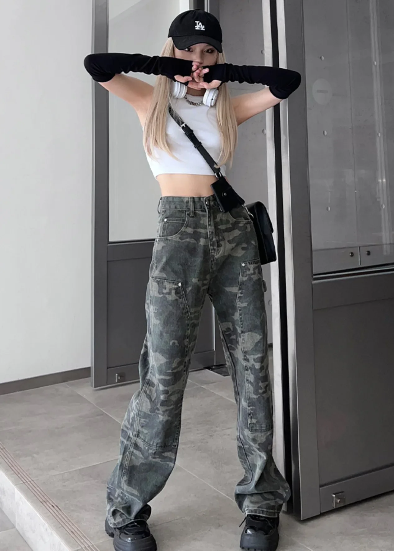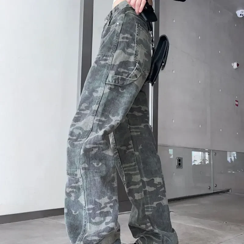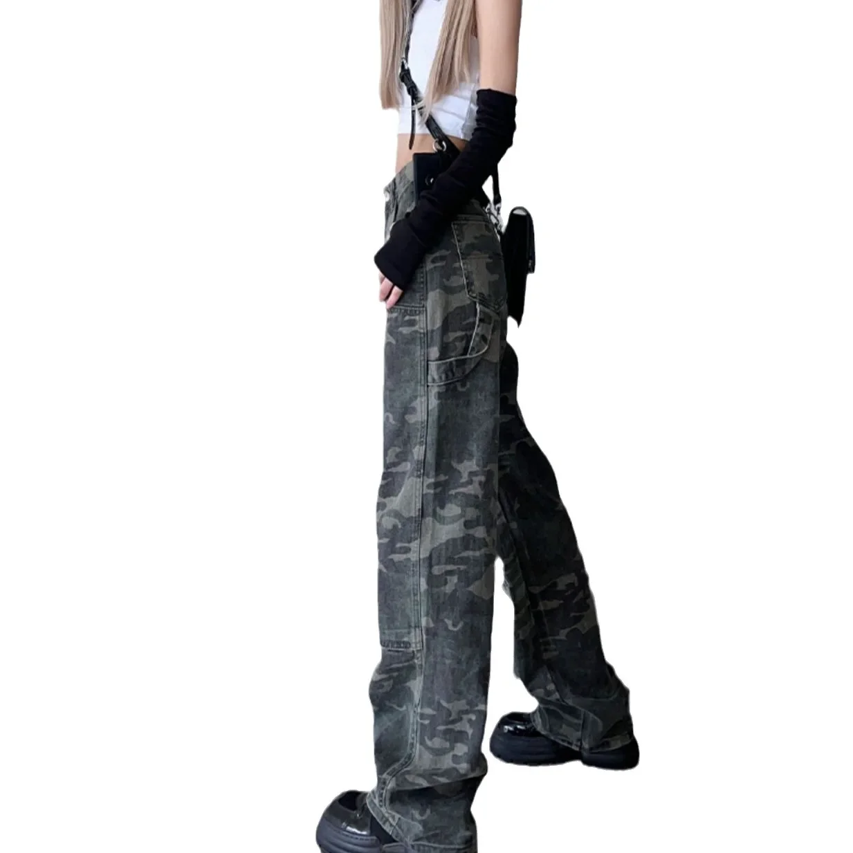 Women Camouflage Jeans Loose High Waist Vintage Cargo Wide Leg Pants Denims Full Length Streetwear Female Denim Trousers