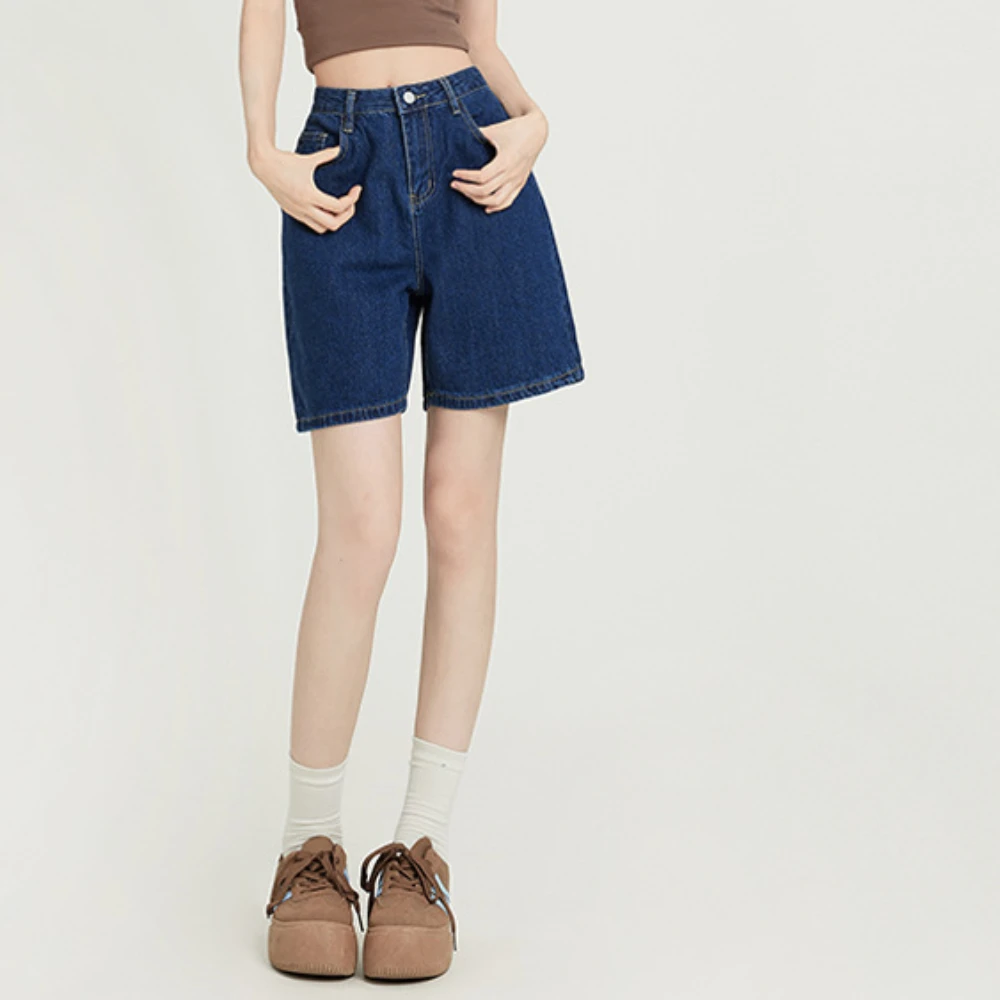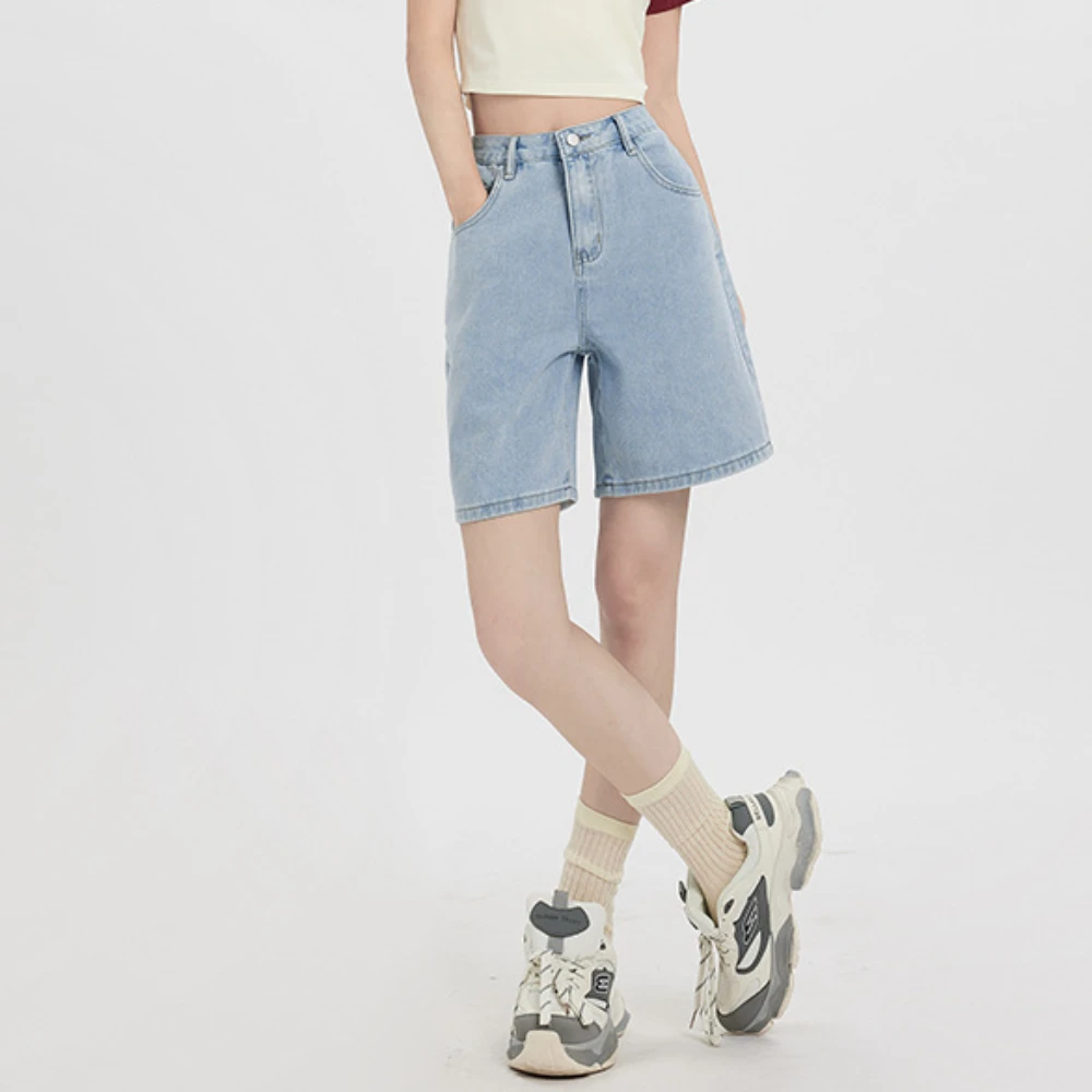 Denim Short Jeans Knee Length Straight Women Jean High Waist Summer Zipper Fly Pockets Loose Vintage Washed 2024 Solid Basics