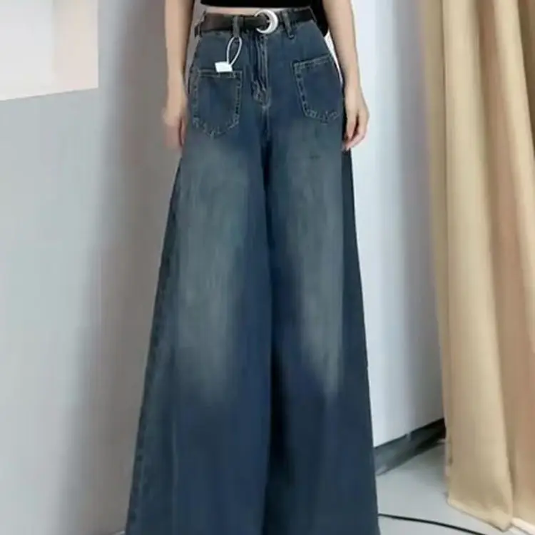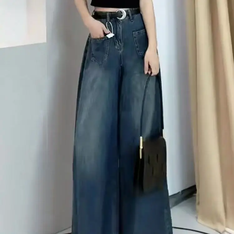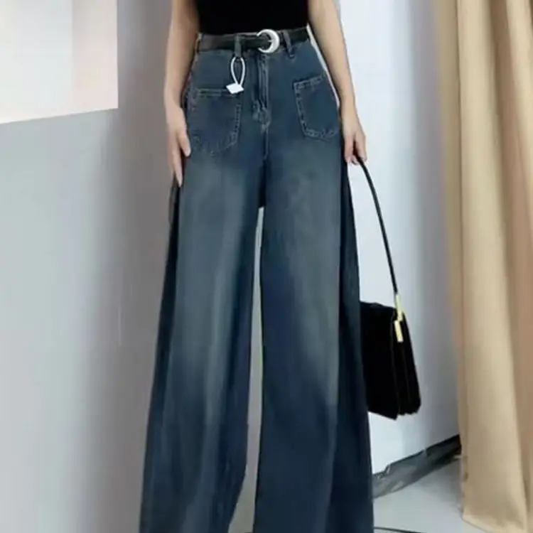Women Vintage Jeans Basics Wide Leg Pants High Waist Pockets Button Solid Colour Full Length Denims Casual Straight Trousers