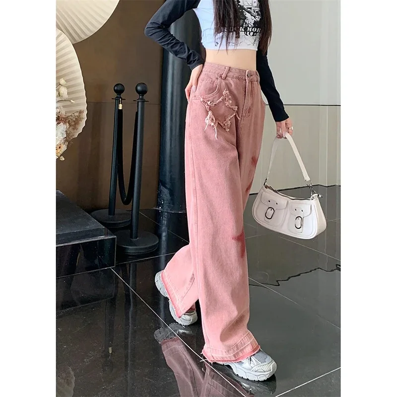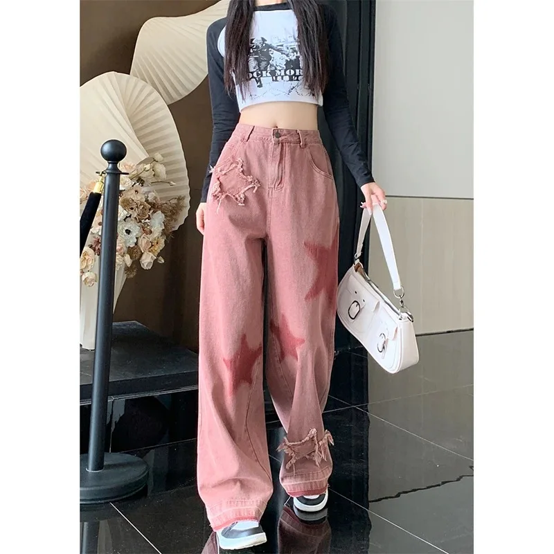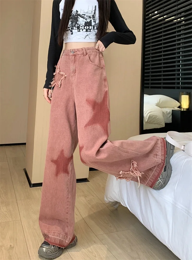 Women Jeans Wide Leg Pants High Waist Pockets Button Basics Pentagram Print Vintage Full Length Straight Trousers Casual Denims