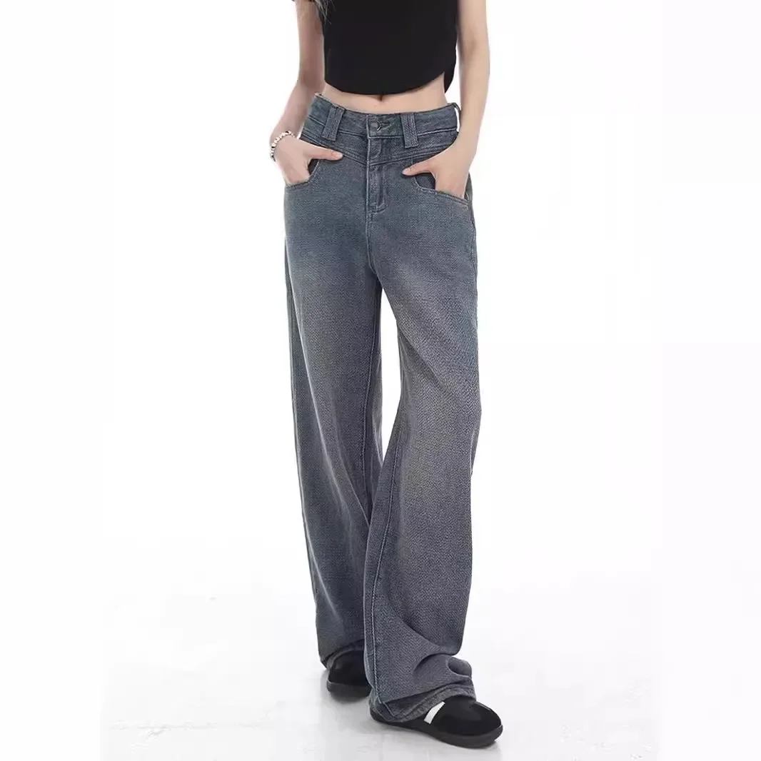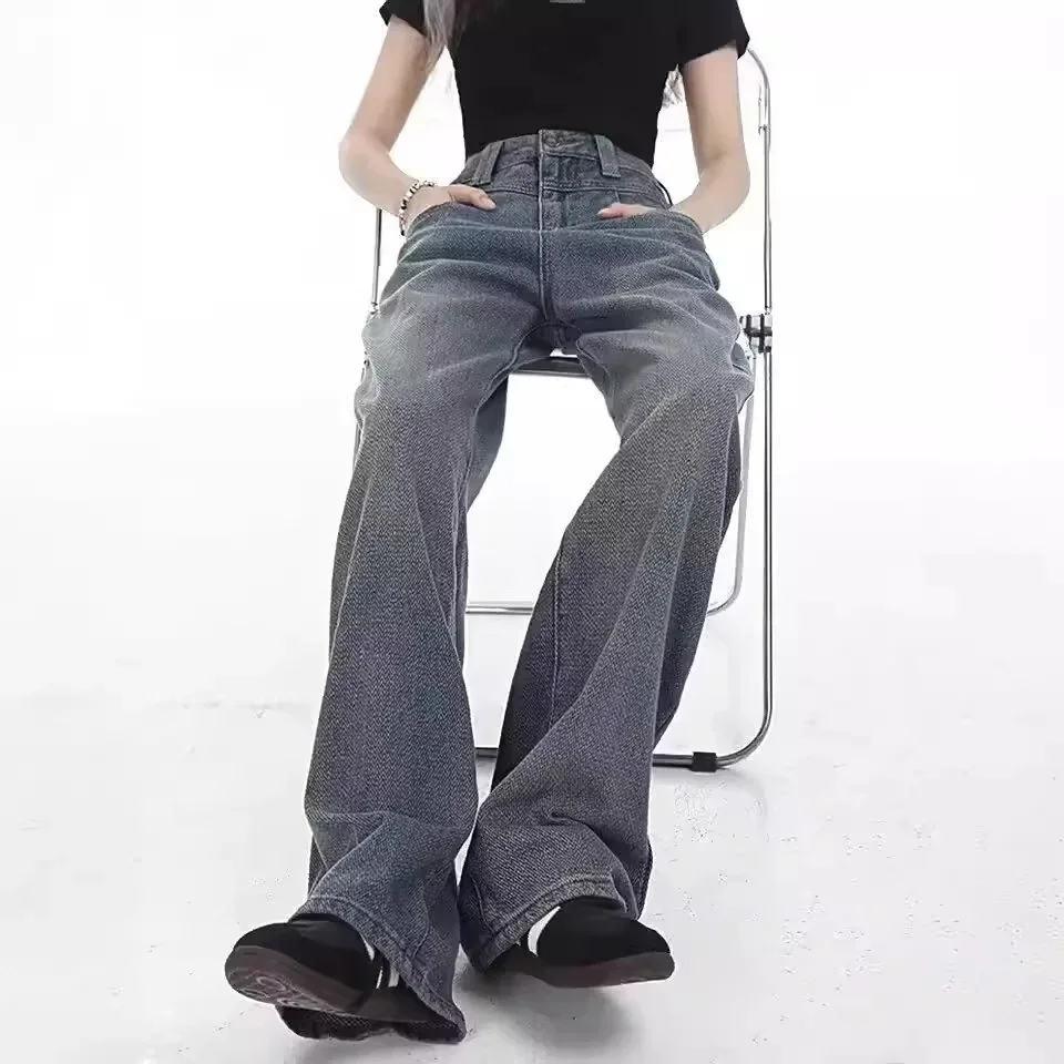 Full Length Straight Jeans Women High Waist Zipper Fly Washed Vintage Denim Loose Fit Pockets Spliced Basics 2024 Distressed