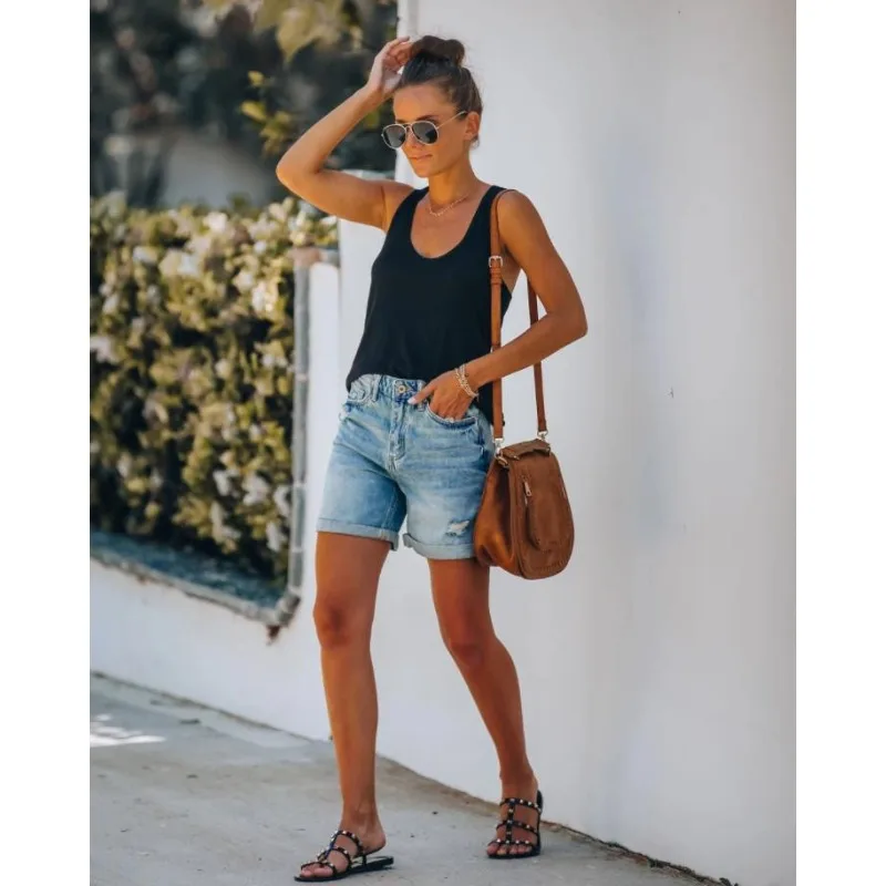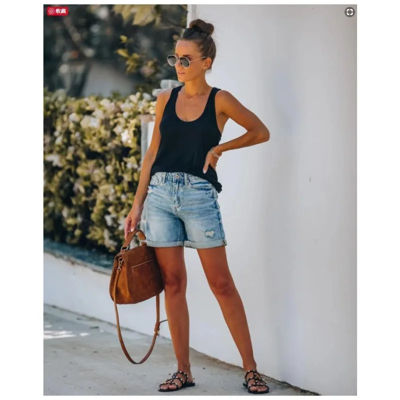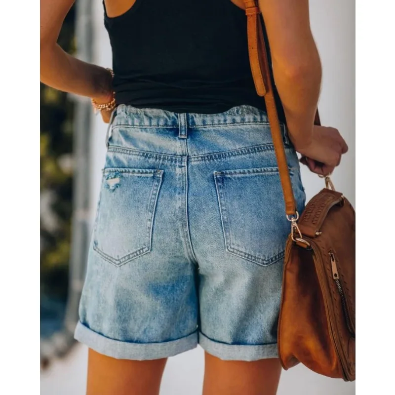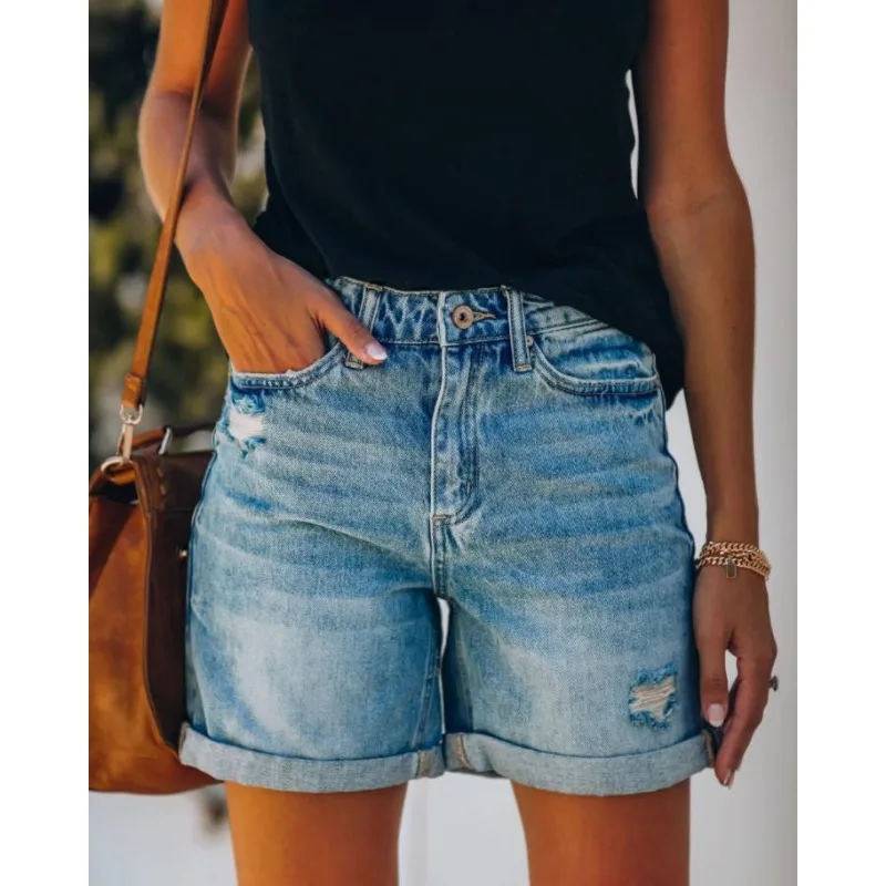 Casual Fashion High Waist Hole Straight Denim Shorts Y2K Clothes Streetwear Women Vintage Ripped Short Jeans