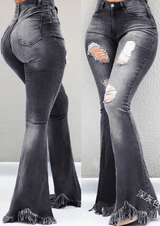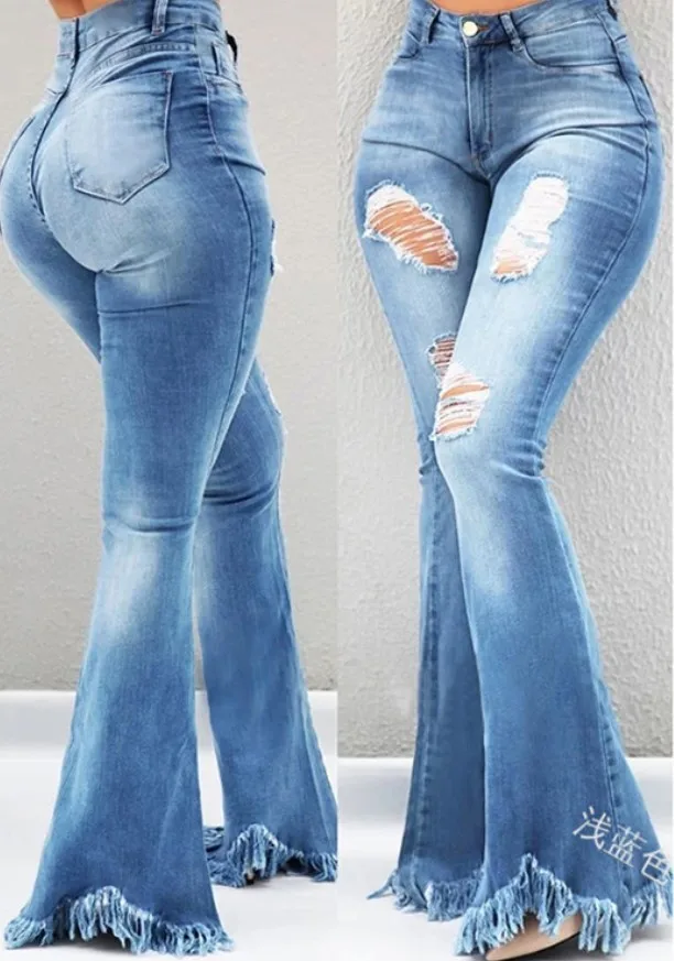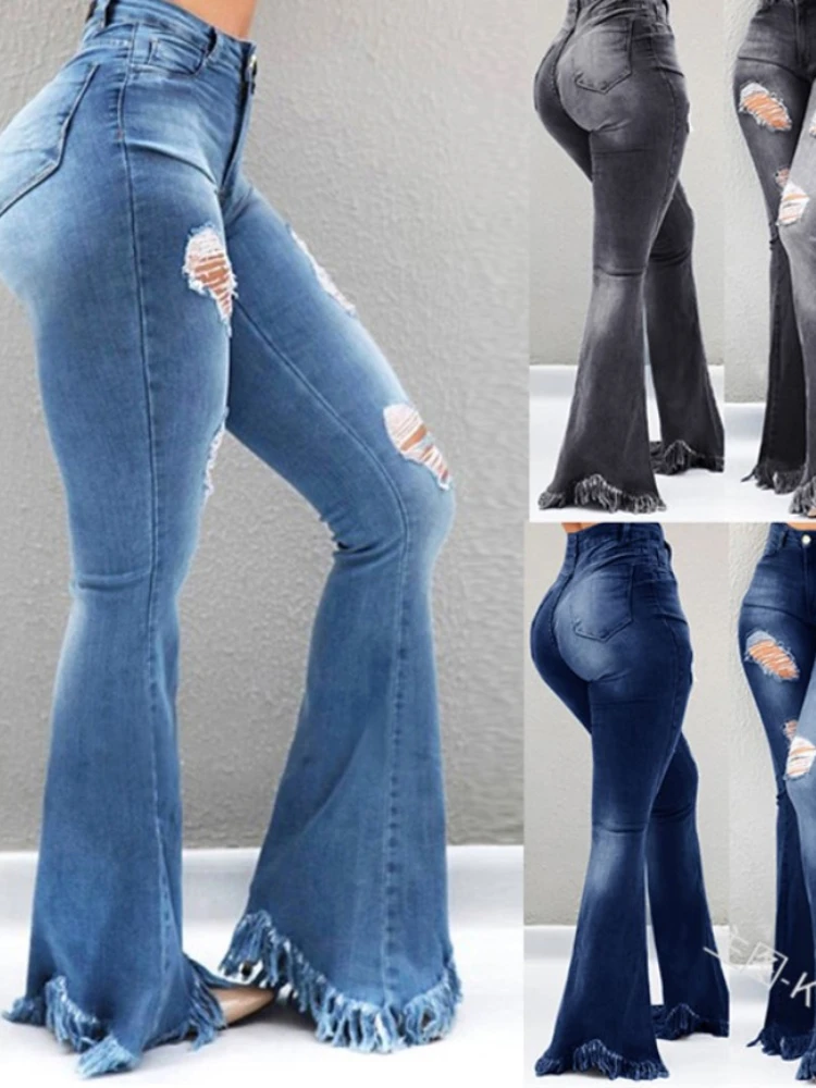 Name | Ripped Jean Distressed Flare Full Length Women Denim Pants Hole Pockets High Waist Washed Bleached Loose Basics 2024 Solid |