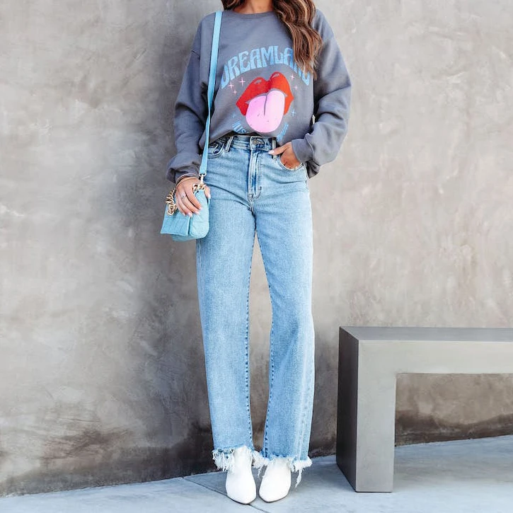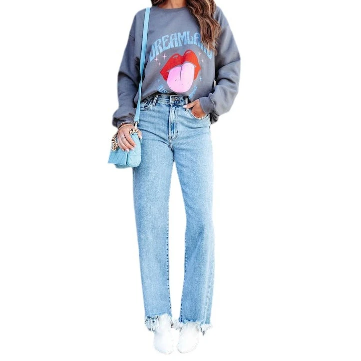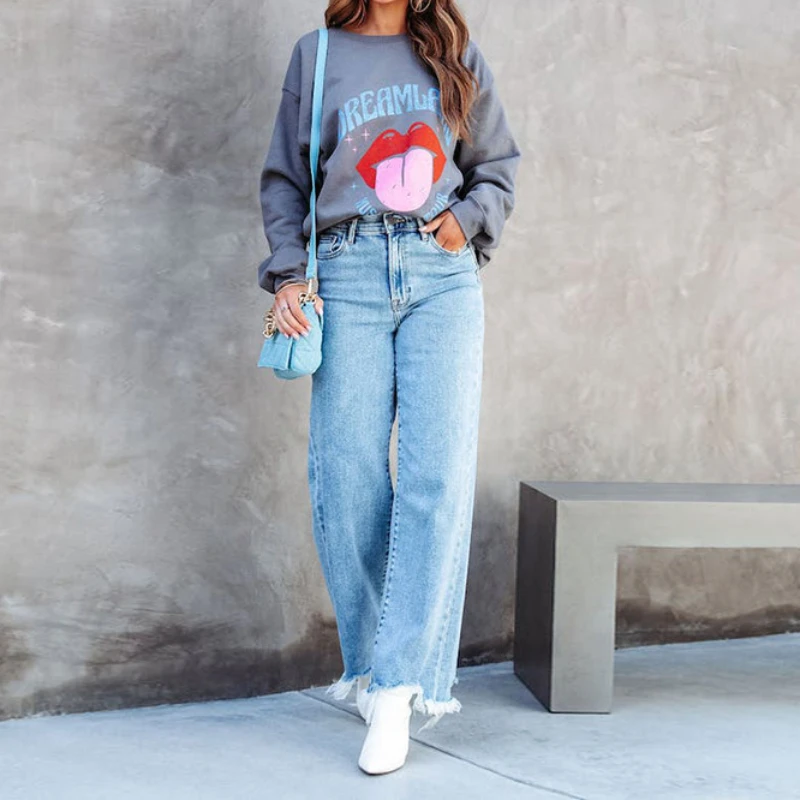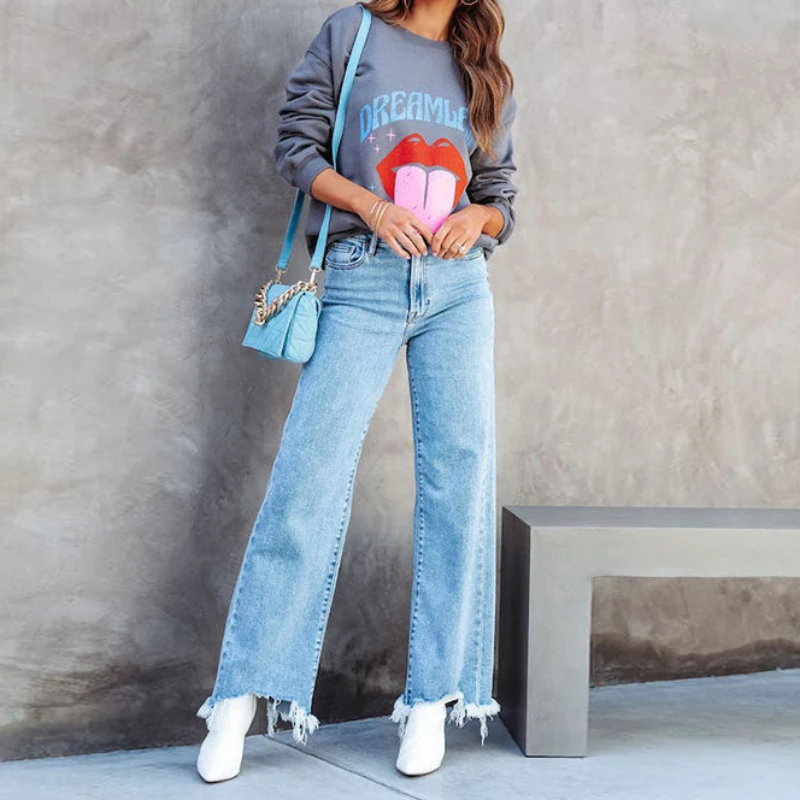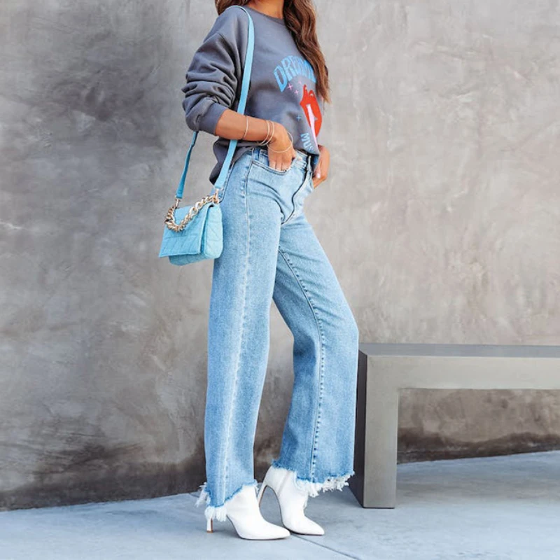 Blue Jeans for Women Wide Leg Pants Straight Long Pant Casual High Waist Hole Denim Trousers Pocket Capris Y2k 2024 Spring