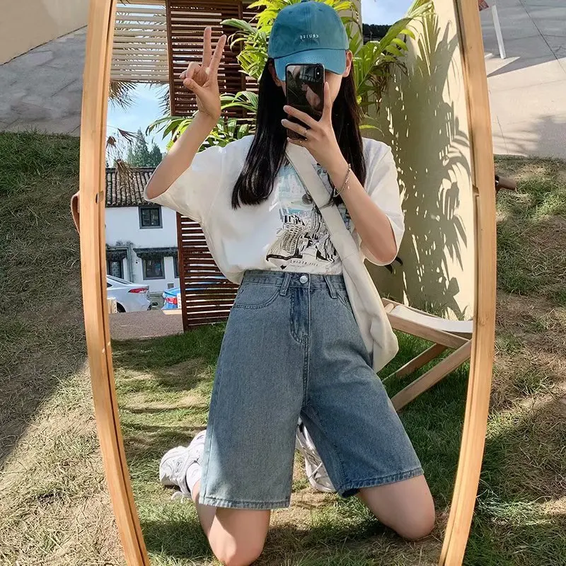 Fashion Summer Half Women Denim Shorts High Waist Belted Loose Female Short Jeans Streetwear