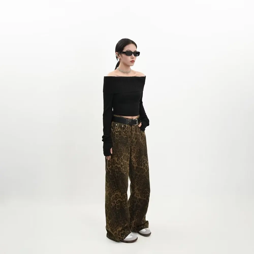 2024 Summer Leopard Jeans Women Denim Pants Female Oversize Wide Leg Trousers Streetwear Hip Hop Vintage Clothes Loose Casual