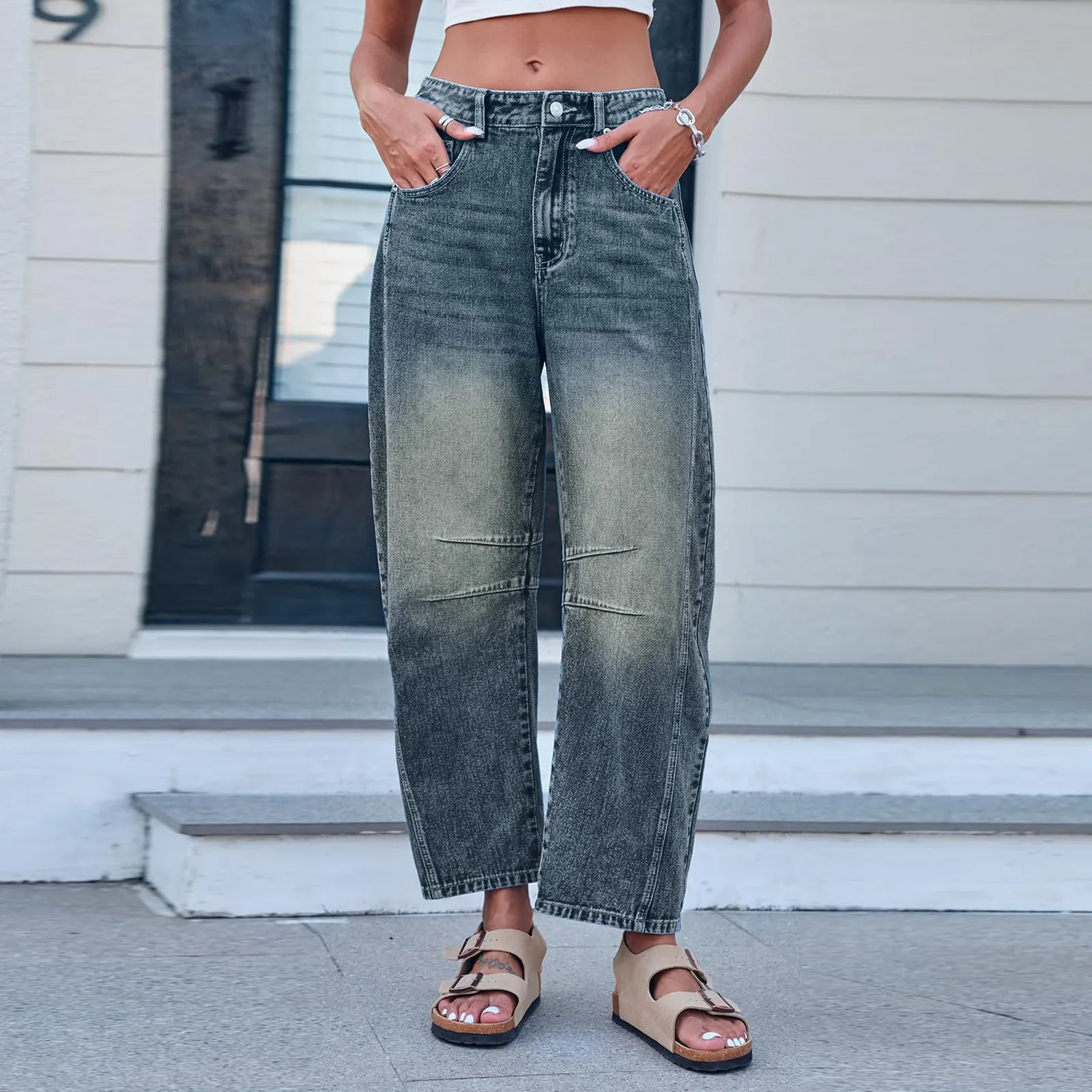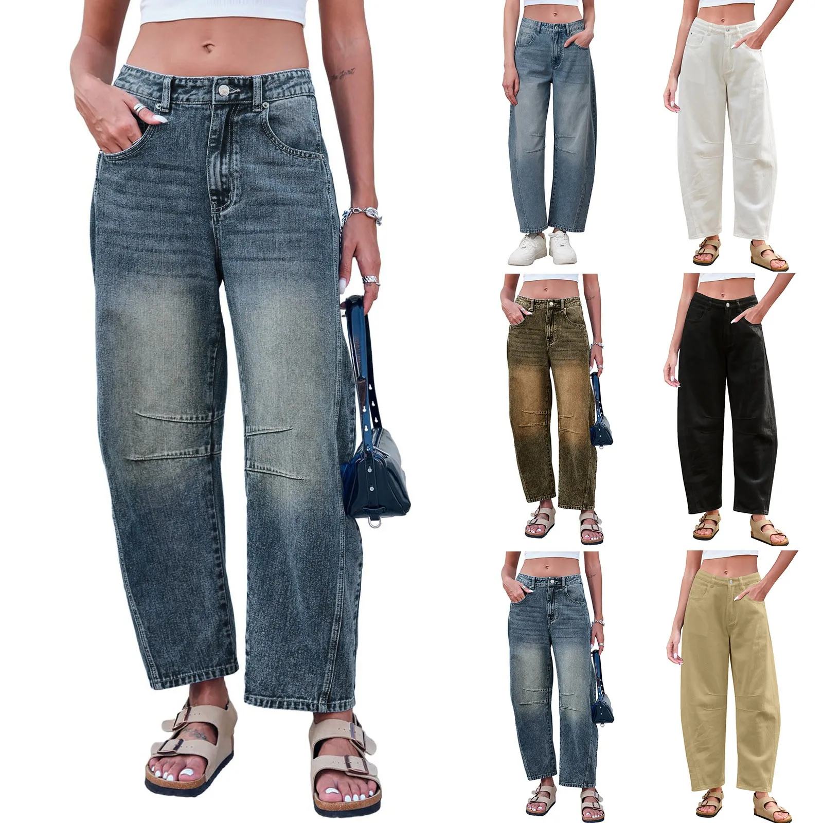Mid Low Waist Washed Cropped Ladies Denim Trousers With Pockets Women's Casual Fashionable Loose Wide Leg Long Jeans Pants