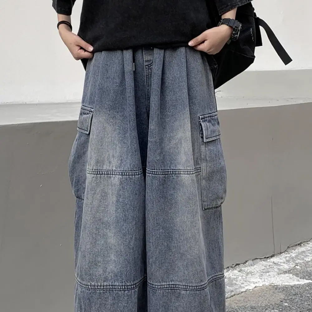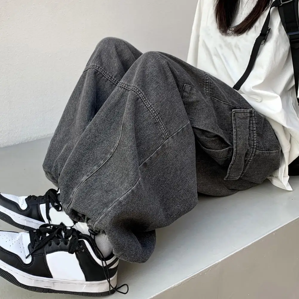 1Pc Straight Unisex Jeans Wide Leg Retro Washed Side Pockets Bloomers Hip Hop Drawstring Elastic Waist Streetwear Long Trousers