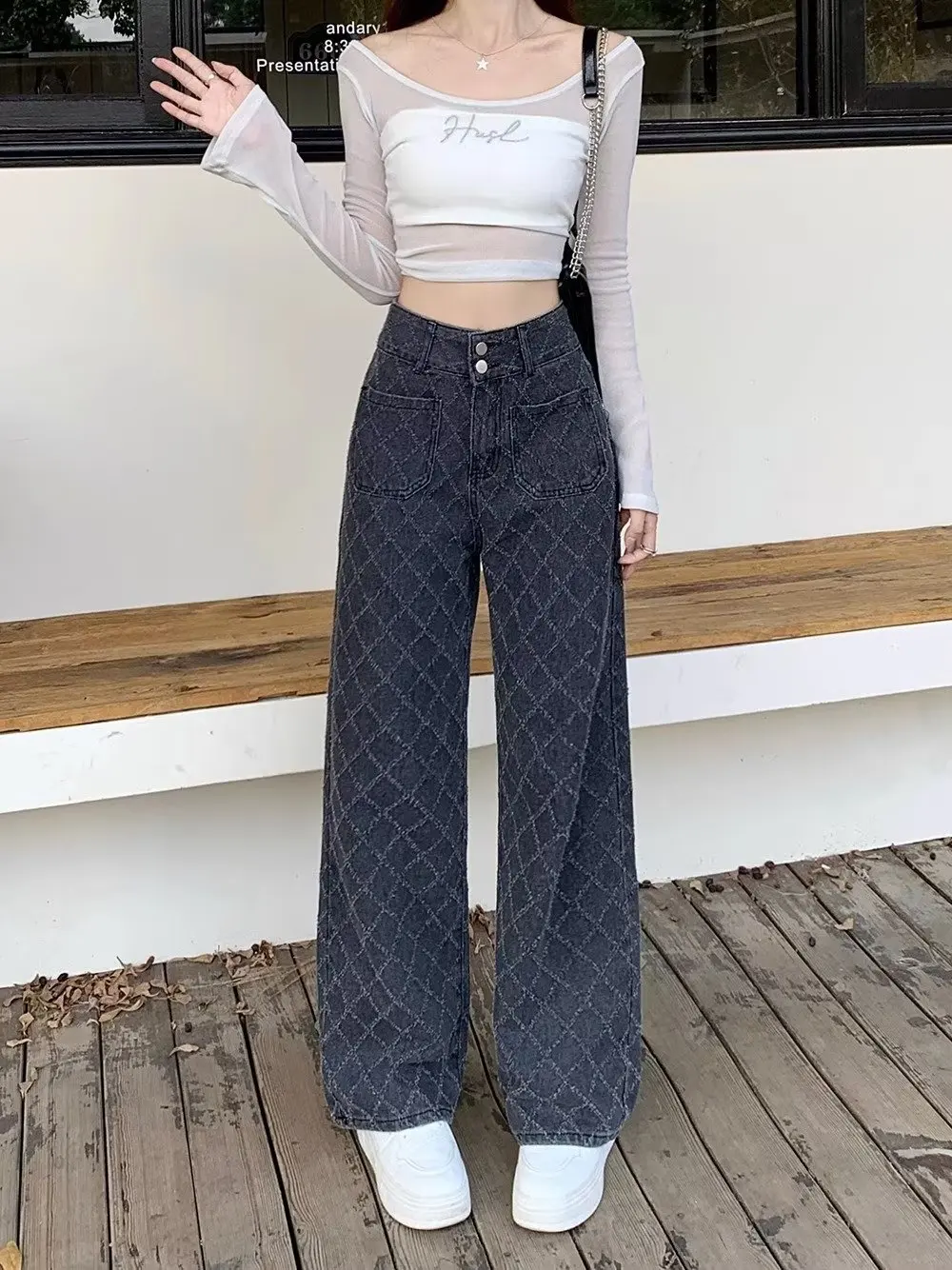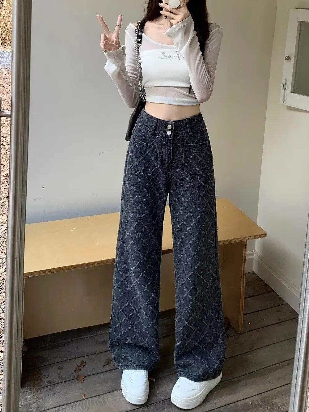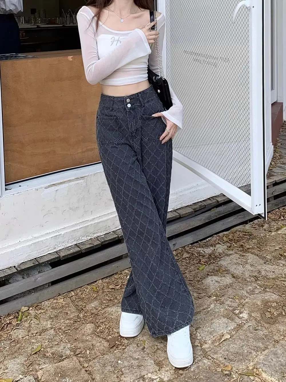 Y2K Style High Street Plaid Jeans Women's Sslim High Waist Straight Loose Hong Kong Style Wide Leg Mop Pants Fashion Stretch Des