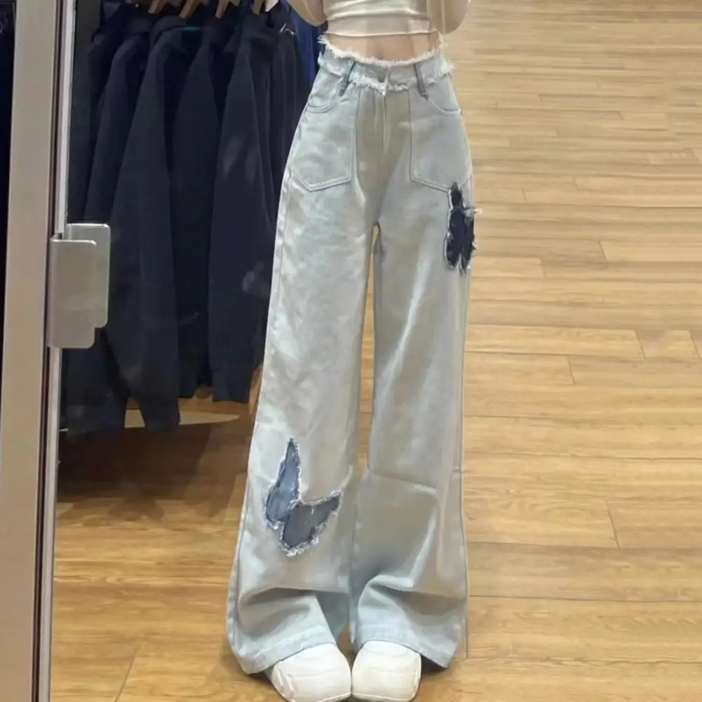 Jeans High Waist Patchwork Wide Leg Jeans for Women Retro Straight Denim Pants with Zipper Button Closure Soft Fabric Trousers