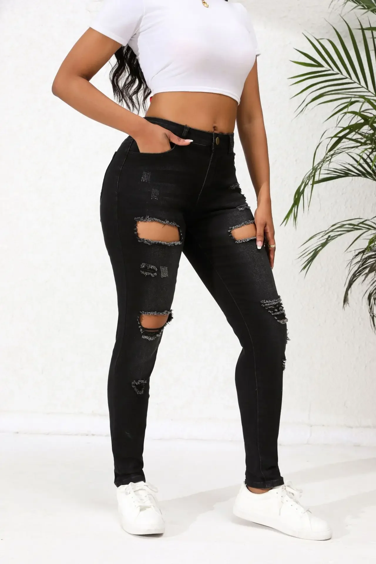 Name | Women Jeans Denim Pockets Holes Pencil Pants High Waist Sexy Skinny Streetwear Solid Ankle Length Spliced Distressed Washing |