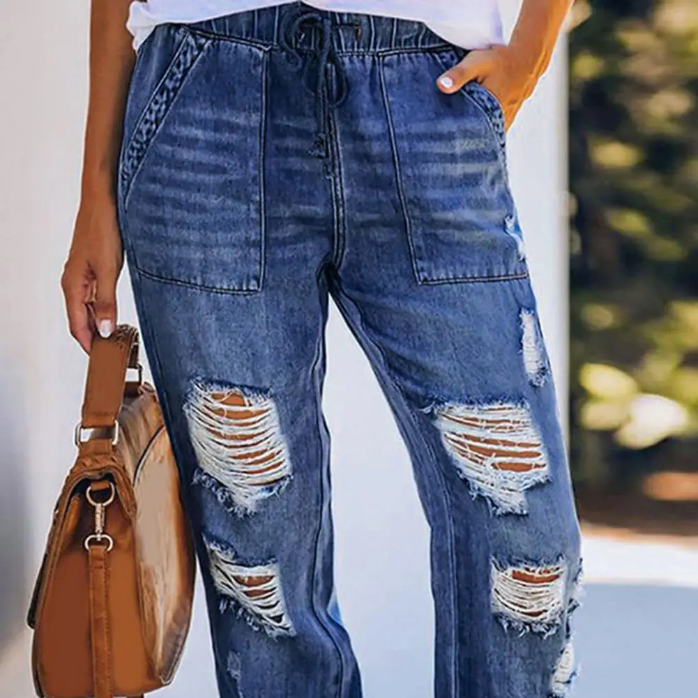 Women Jeans Solid Color Ripped Pockets Harem Pants Elastic Waist Drawstring Hole Loose Leggings Trousers Casual Pants