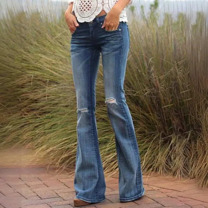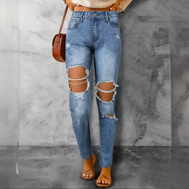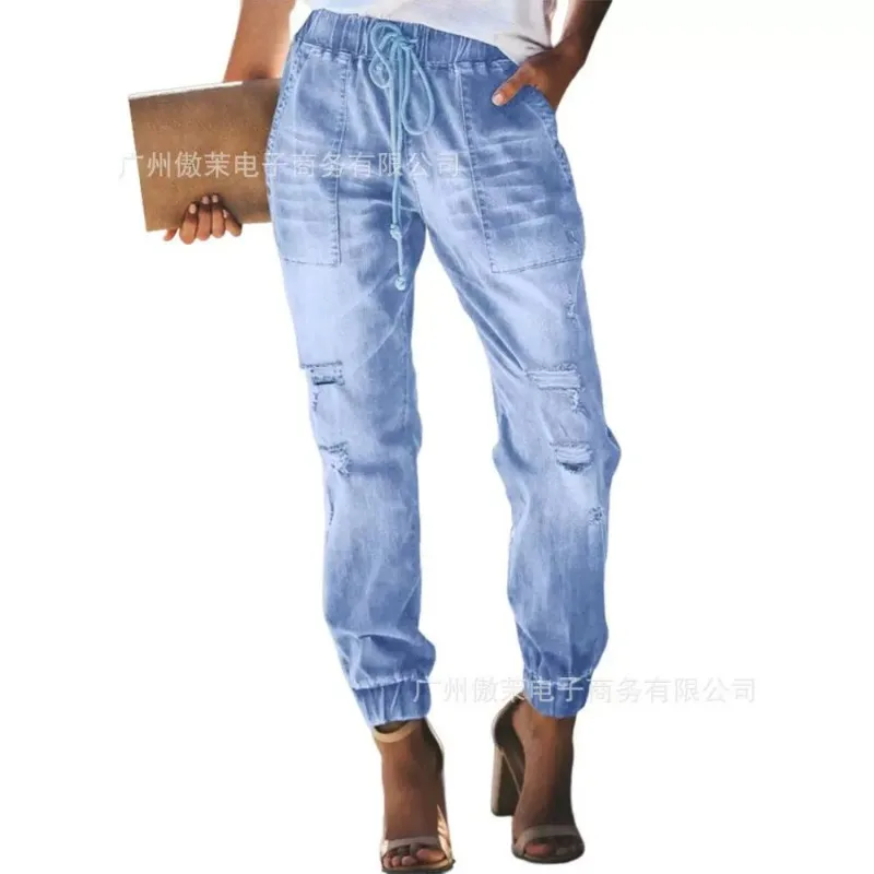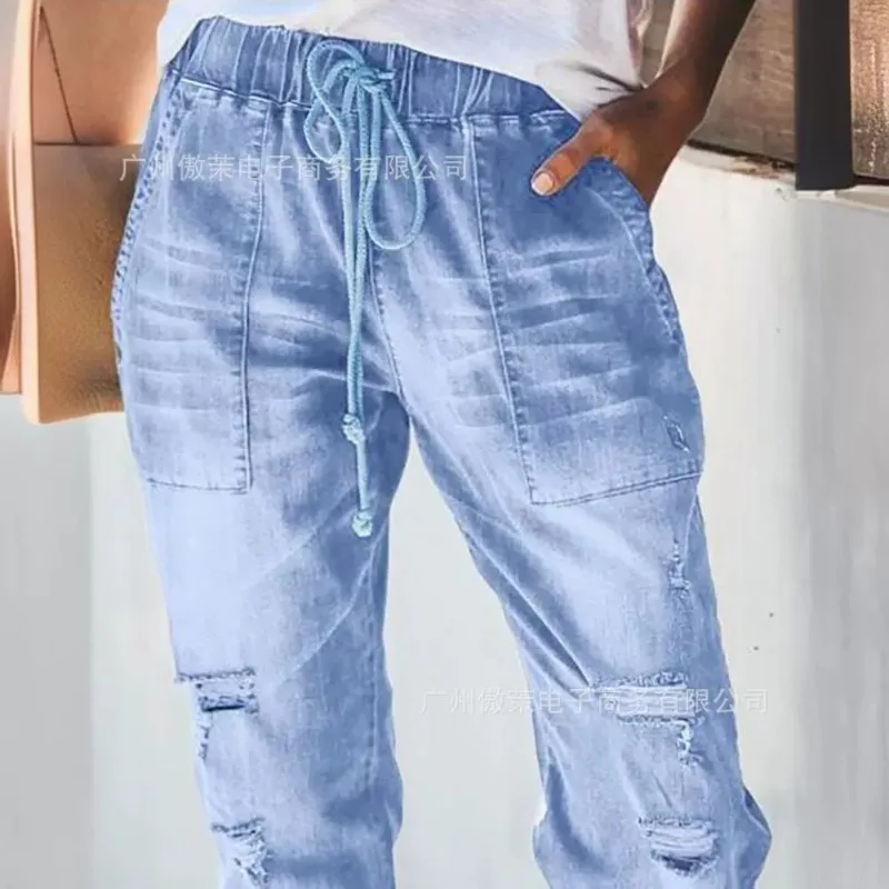 2024 Spring Summer New Women's Clothing Fashion Trend Dark Blue Ripped Elastic Bandage Ankle-Tied Jeans