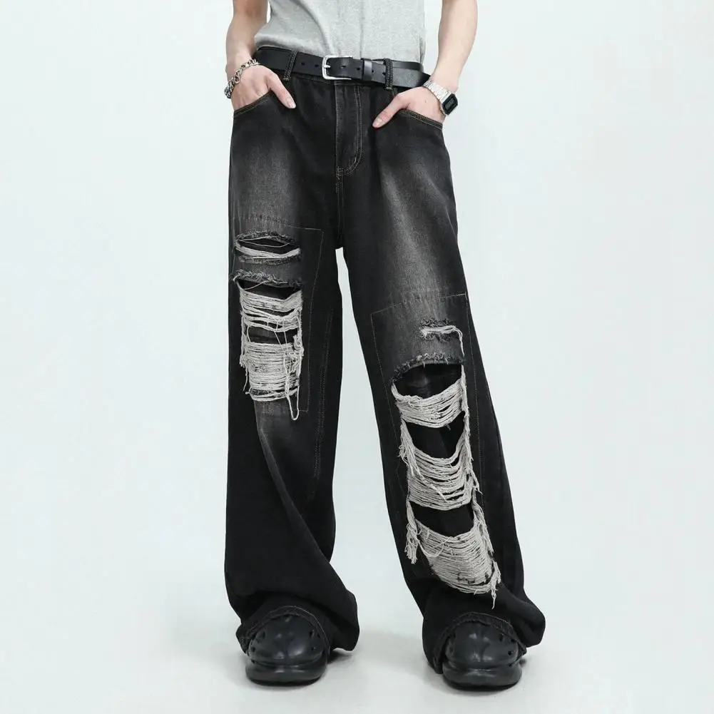 Women's Jeans High Waist Wide Leg Loose Ripped Hip Hop Straight Solid Color Goth Retro Pocket Streetwear Denim Trousers