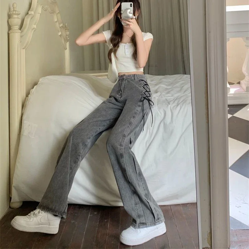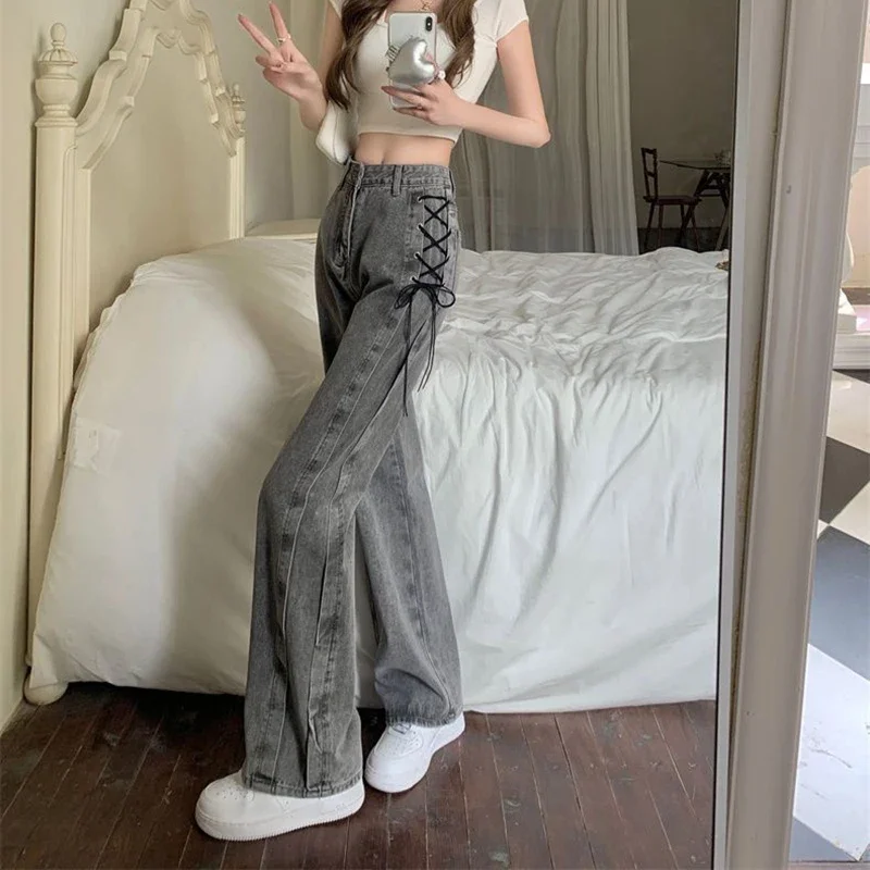 Black Gray Lace Up Design Jeans Women Vintage High Waist Straight Denim Pants Female Autumn Winter New Chic Wide Leg Trousers