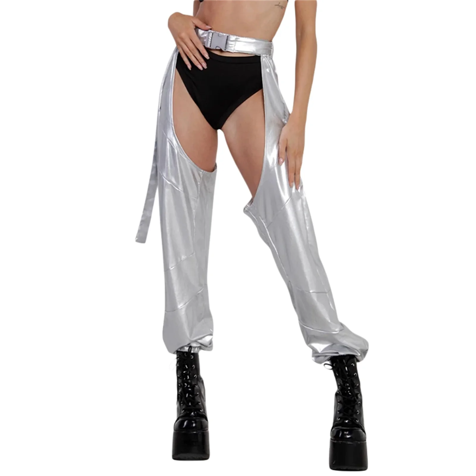Name | Women's Rave Chaps Ladies Sexy Hollow Out Patchwork/ Solid Loose Fit Buckle Trousers for Club Wear Bottomless Festival Pants |