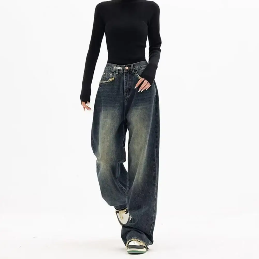 Casual Style Women Pants Vintage High Waist Wide Leg Denim Jeans with Deep Crotch Pockets Women's Floor Length Loose for Hip