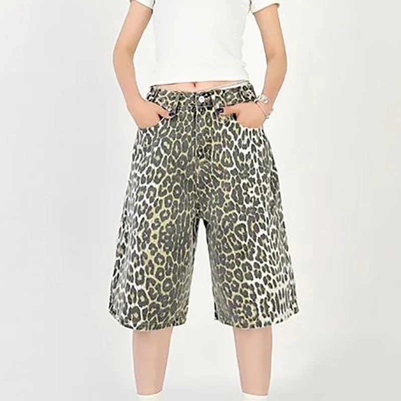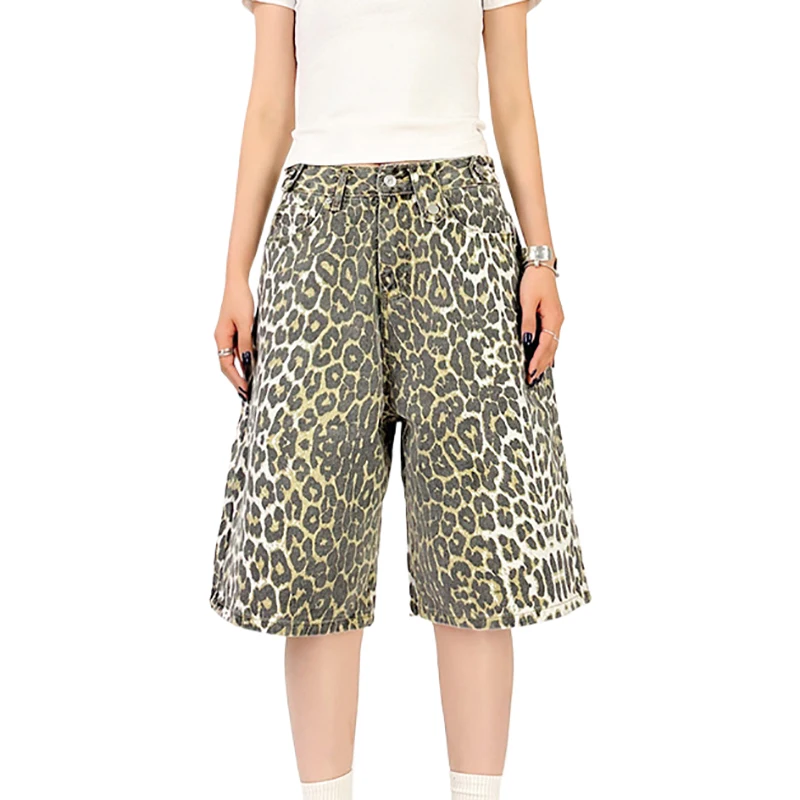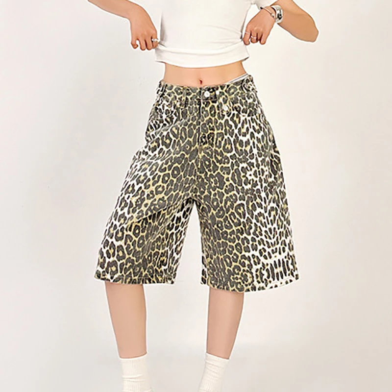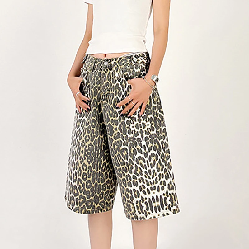 Vintage Leopard Print Baggy Denim Shorts Wide Leg Pants Woman & Men Knee Length High Waisted Barrel Jeans Shorts Streetwear