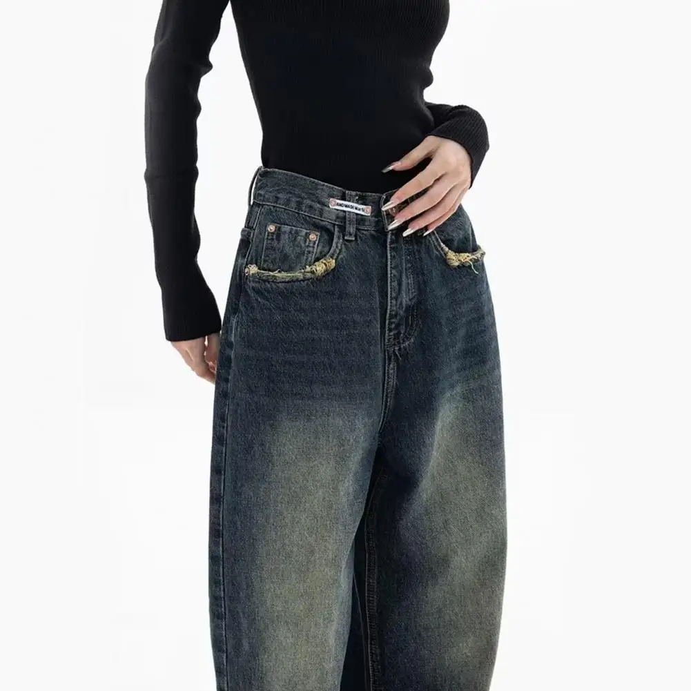 Vintage Women Denim Pants High Waist Wide Leg Denim Jeans with Crotch Pockets Button Closure Straight Pants Streetwear