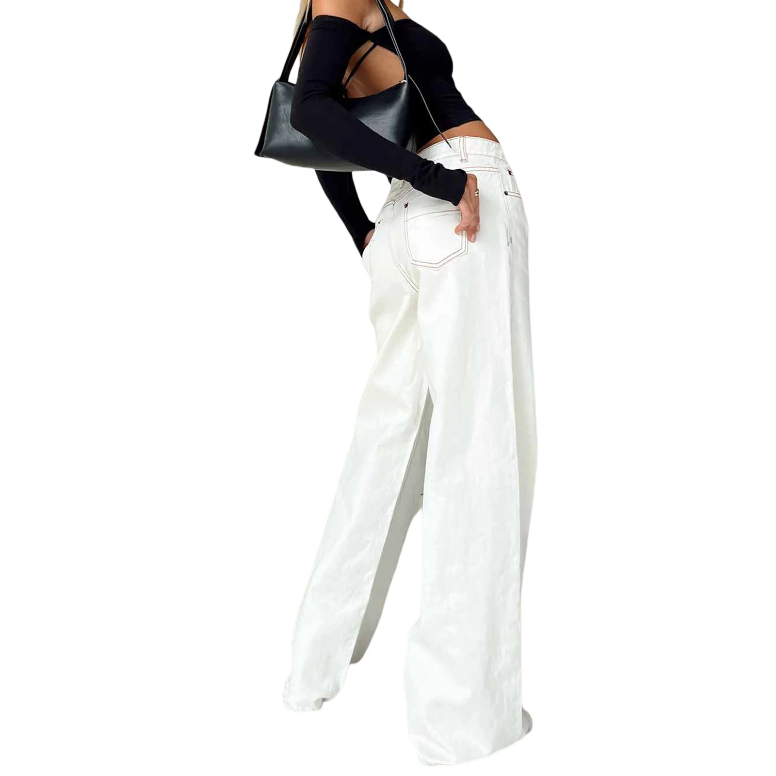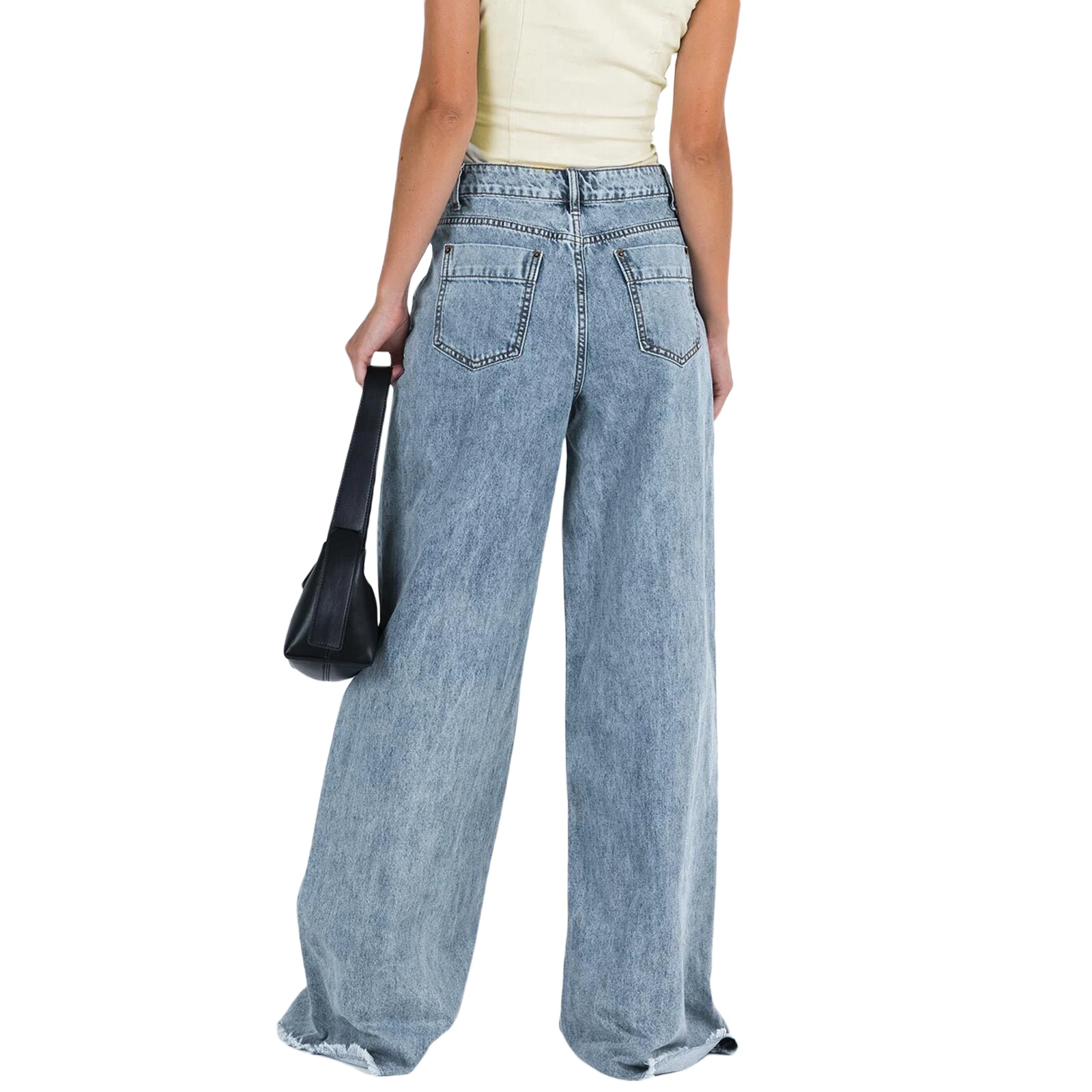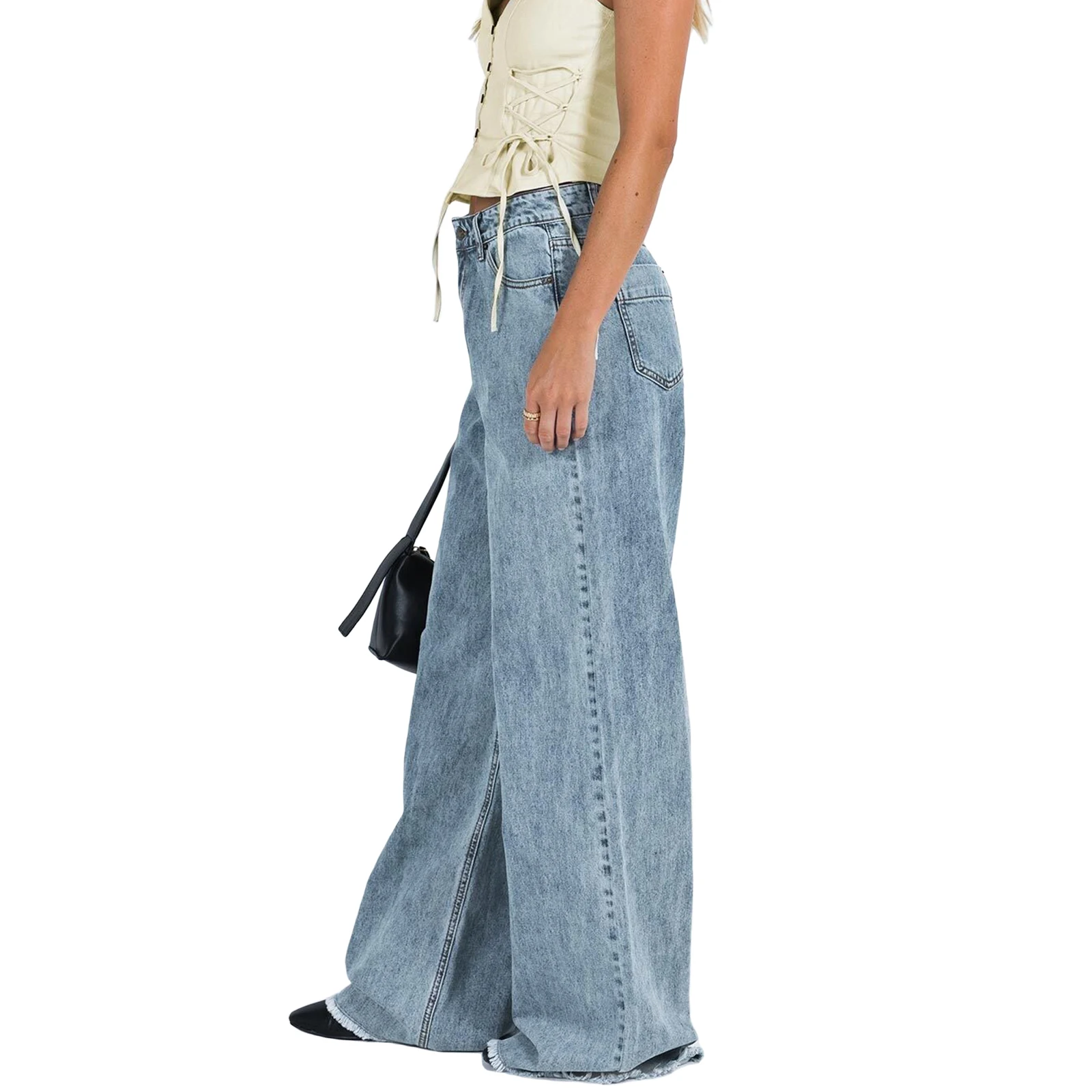 Women Wide Leg Jeans Trousers Solid Color Elastic Casual Loose Pants for Work Office Streetwear