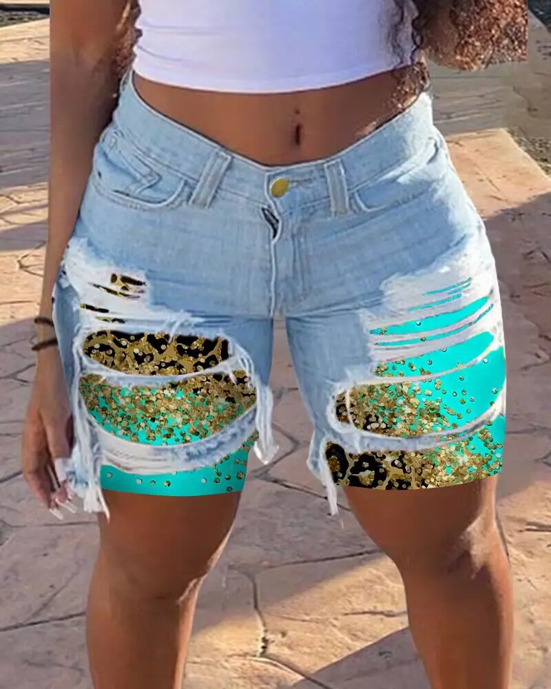 Contrast Leopard Print Ripped Patchwork Denim Shorts Women High Waist Summer Spring Fashion Sexy Shorts Jeans Pants