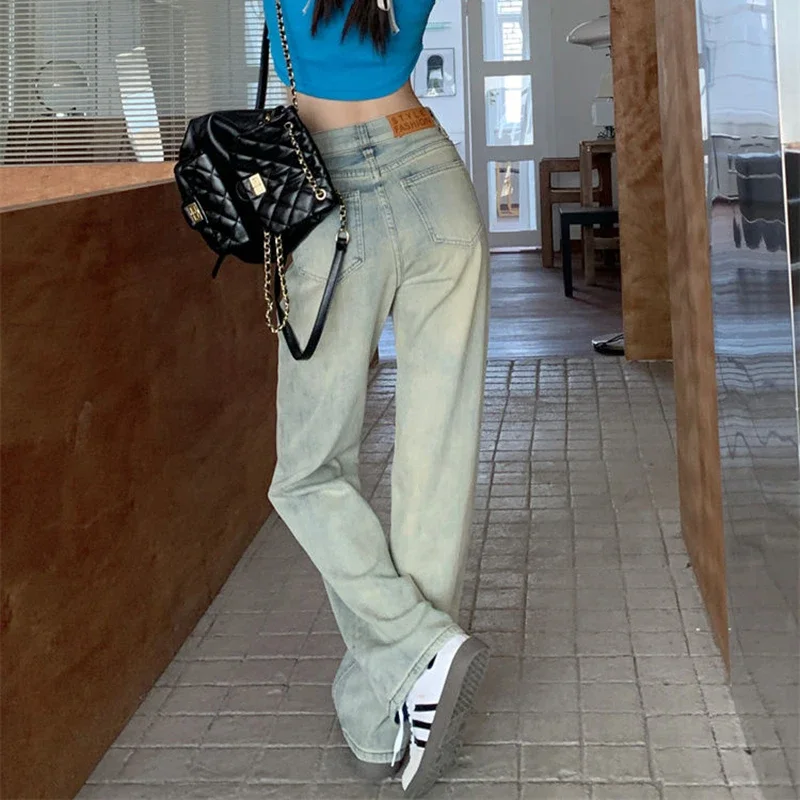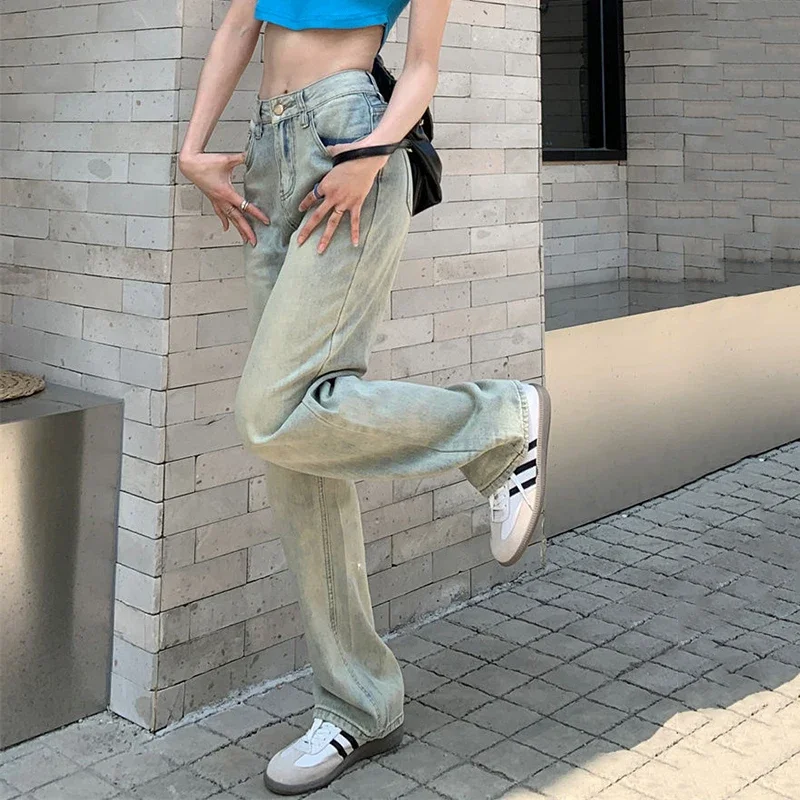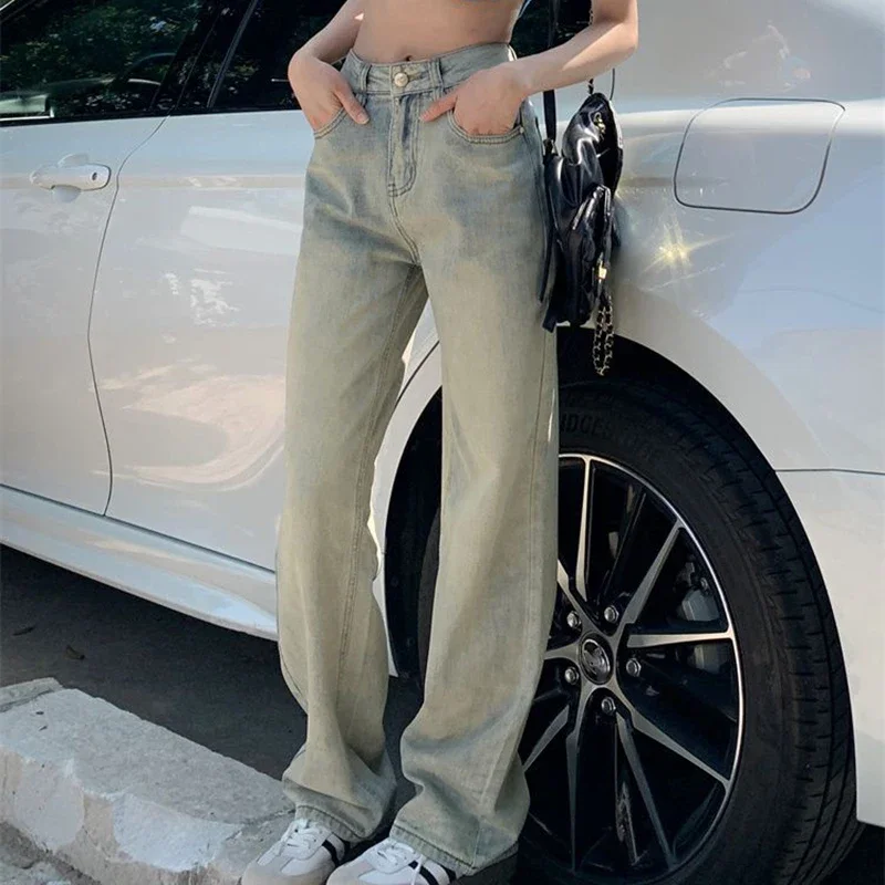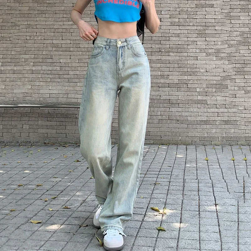 Name | Light Blue Washed Jeans for Women Vintage Distressed High Waist Denim Trousers Female Korean Streetwear Straight Pants |