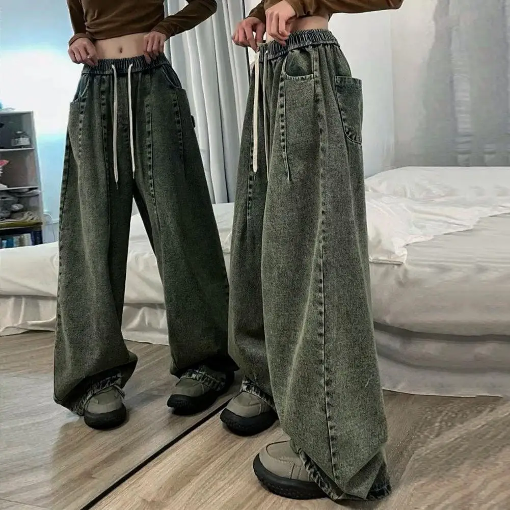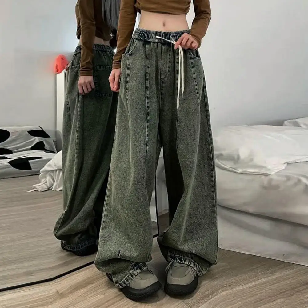 Name | Women Denim Jeans High Elastic Waist Drawstring Baggy Trousers Hip Hop Streetwear Cargo Pants Casual Loose Straight Pants |
