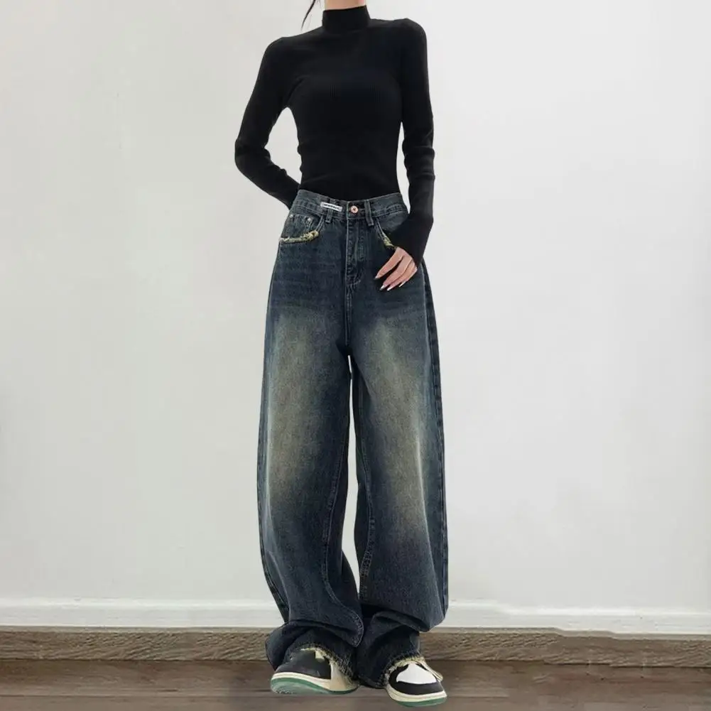 Soft Denim Pants Vintage High Waist Wide Leg Denim Jeans with Deep Crotch Pockets Women's Streetwear Fashion Button Closure