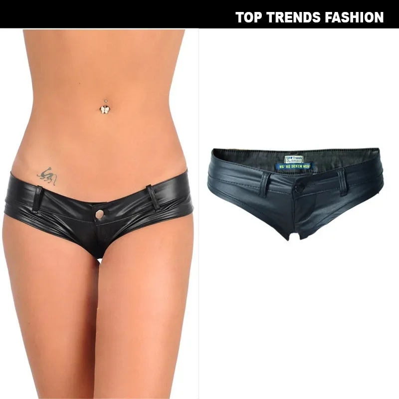 Womens Shorts Nightclub Sexy Low Waisted Elastic Denim PU Faux Leather Button Up Zippered Hot Pants for Women
