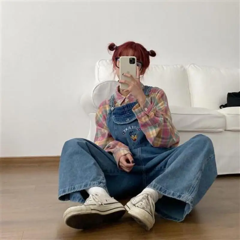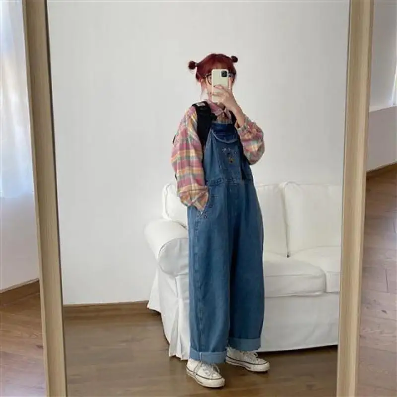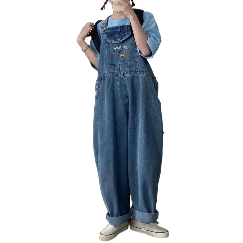 Japanese Loose Cute Jumpsuits Women New Cartoon Embroidery Oversized Denim Overalls Female Strap Straight Pant Wide Leg Trousers