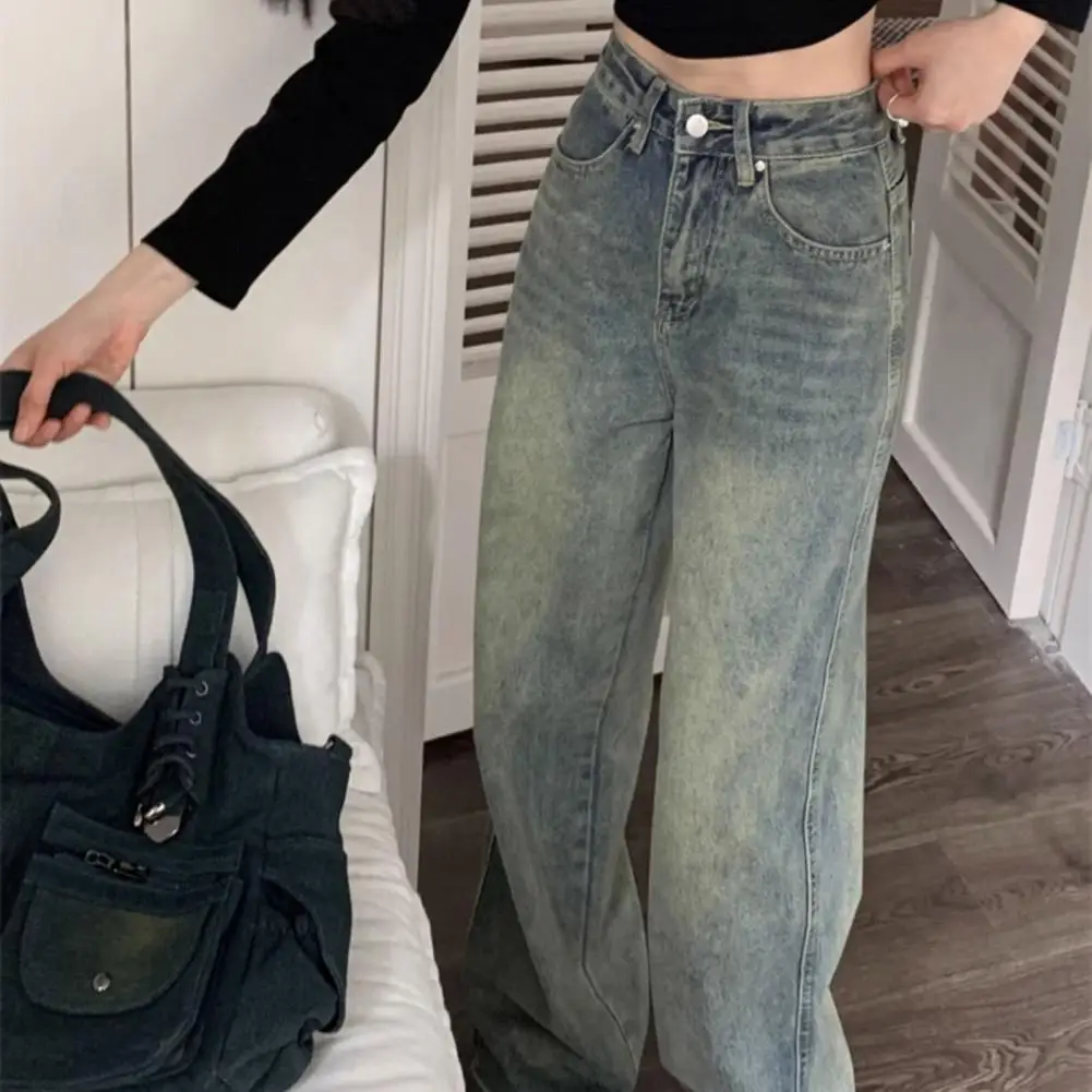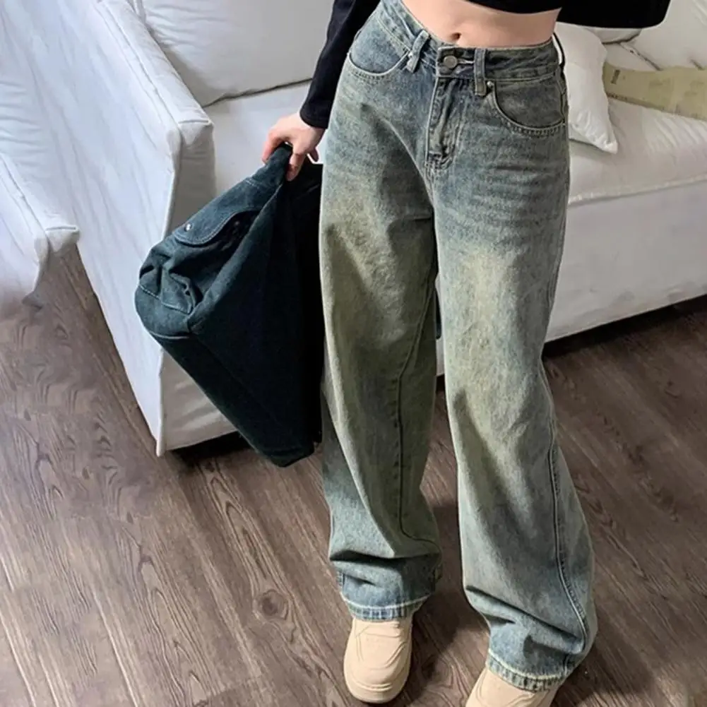Women Jeans High Waist Zipper Button Closure Loose Wide Leg Distressed Straight Pockets Denim Pants джинсы женский