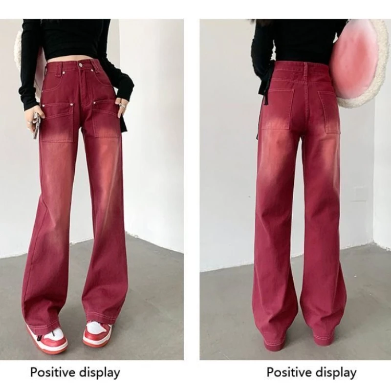 European American Style Retro Wine Red Jeans Women's Spring Autumn New Trendy Brand Loose High Street Casual Wide Leg Long Pants