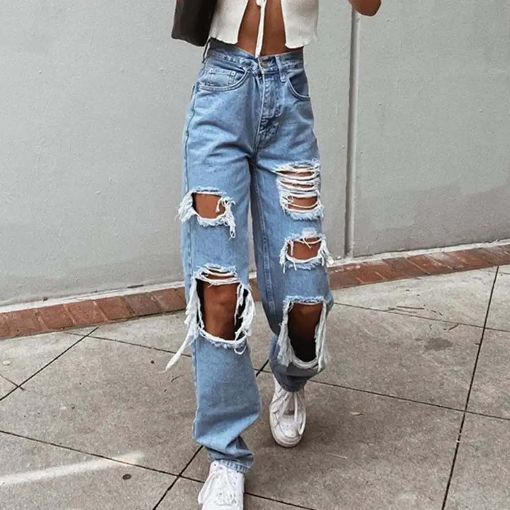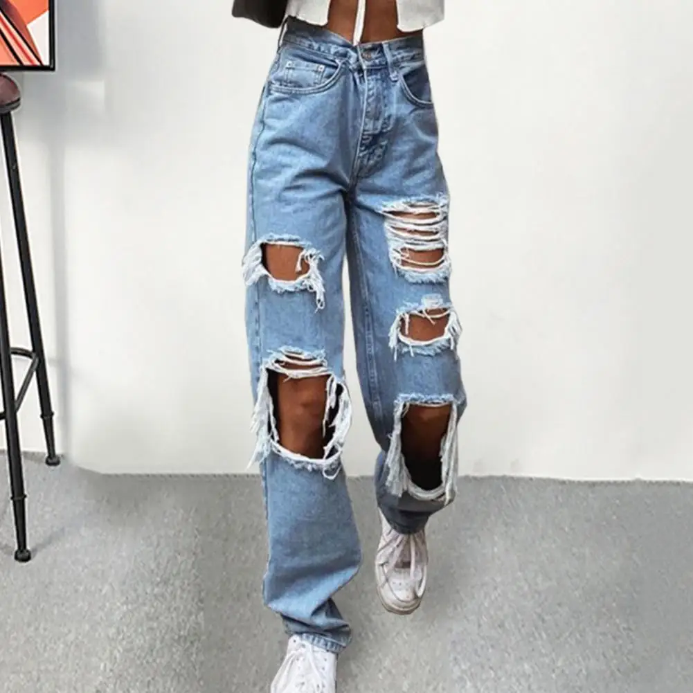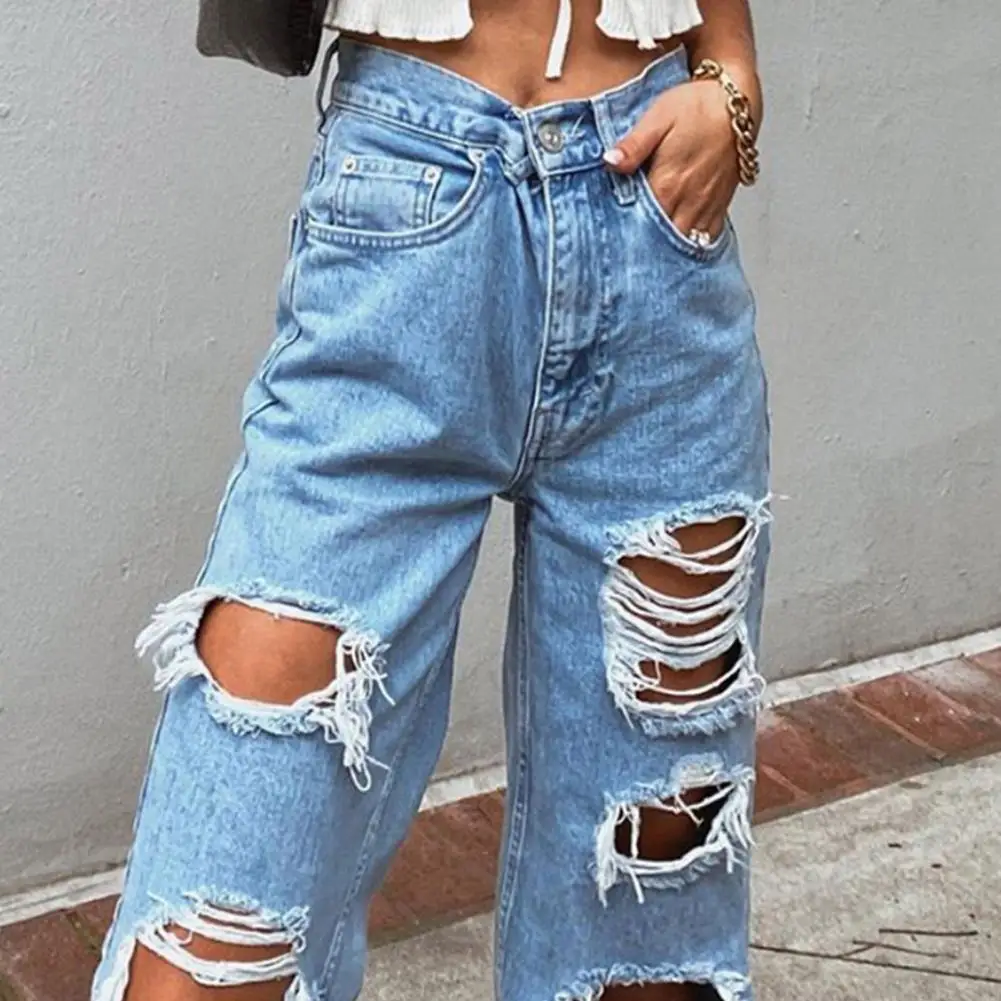 Women Jeans Pants Wide Leg High Waist Daily Wear Denim Trousers No Stretch Women Ripped Loose Fit Jeans Summer Clothes Workwear