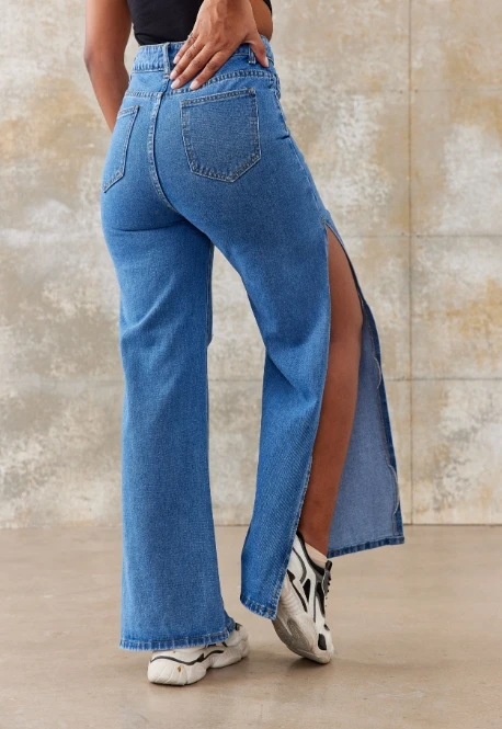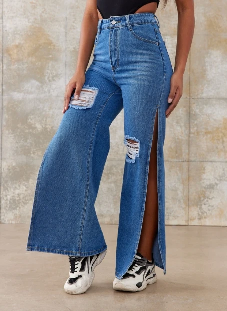 Women's Jeans 2024 Fashion Trend Street Sexy Perforated Large Split Jeans High Waisted Wide Leg Straight Leg Split Pants