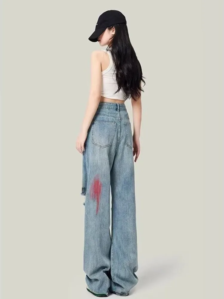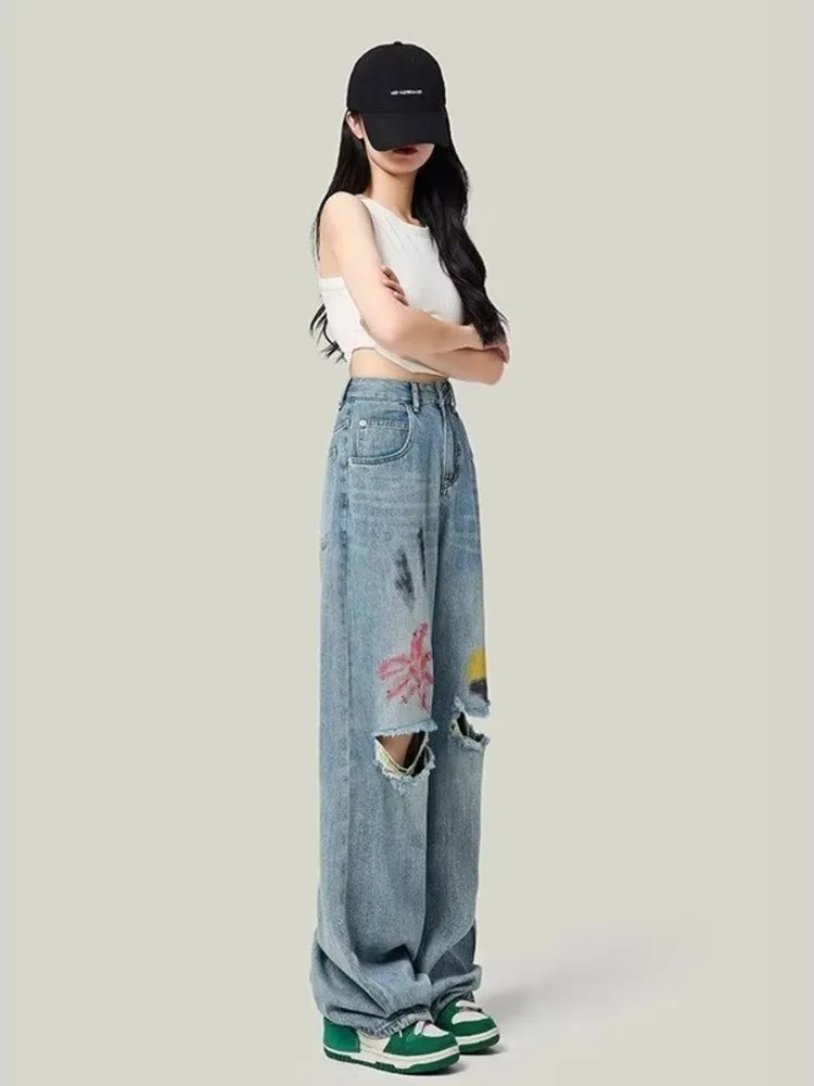 Colored Distressed Wide Leg Jeans Summer High Waisted Loose And Slimming Floor Dragging Straight Leg Trendy Women's Jeans