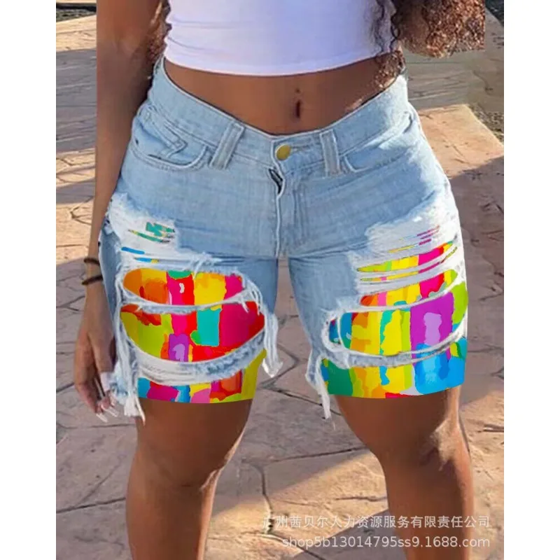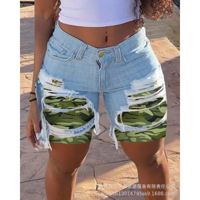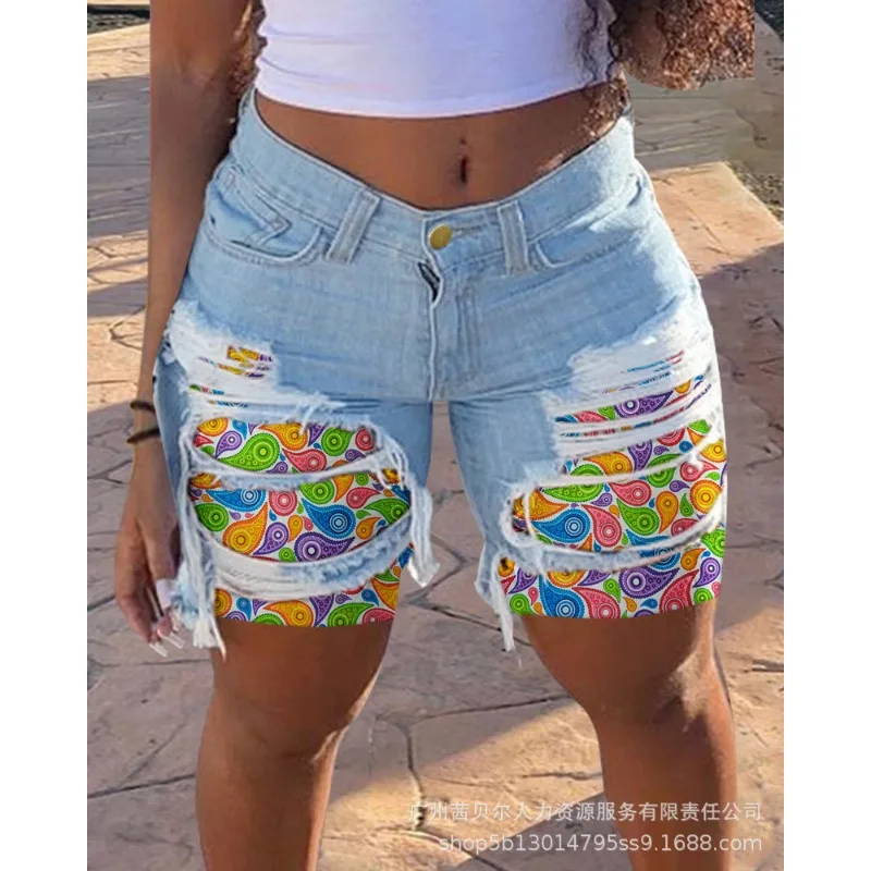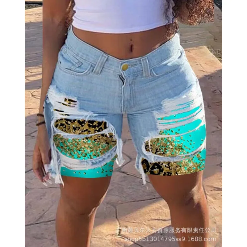 Women Vintage Hole Short Jeans Y2K INS Clothing Streetwear Leopard Print Patchwork Raw Hem Denim Shorts