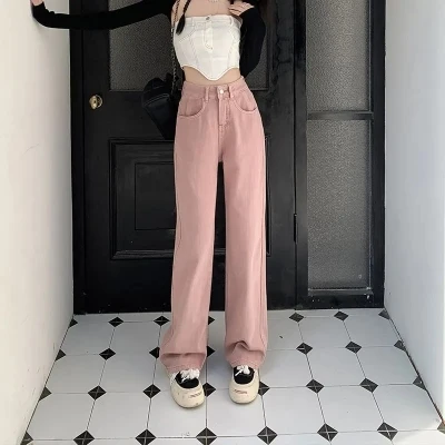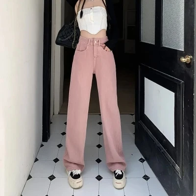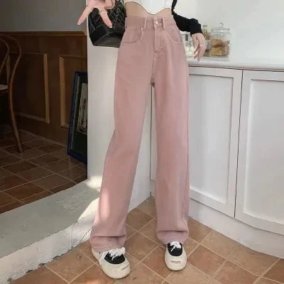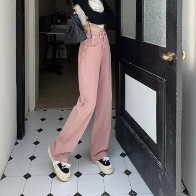 Pink Straight Leg Jeans for Women Spring 2024 New High Waist Wide Leg Pants Fashionable Solid Color Pants Women's Clothing