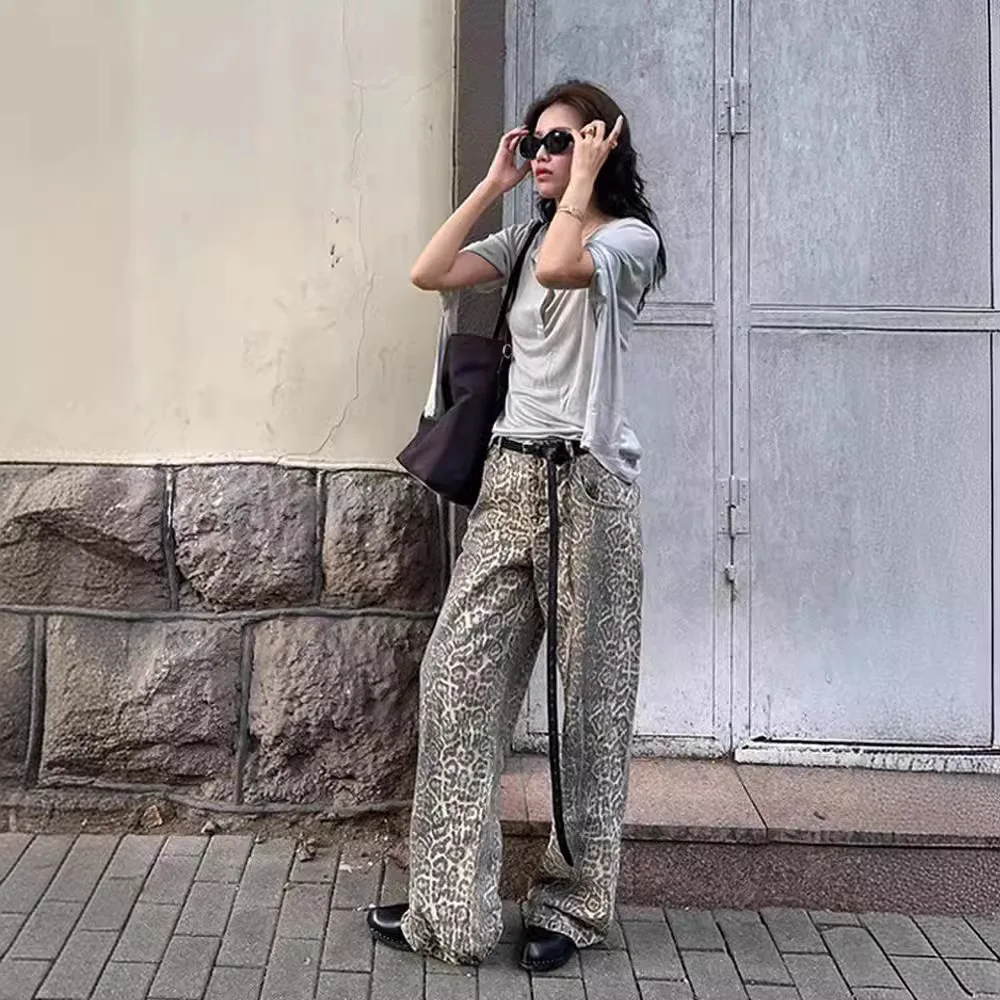 Name | American Retro Leopard High Waist Baggy Jeans Women's Casual Pockets Hip-hop Pants 2024 Spring Y2K Oversiz Panther Denim Trouser |
