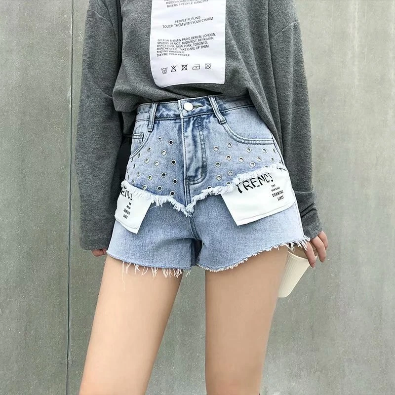 Loose Letter Pocket Denim Shorts Woman 2023 New Summer Fashion Ladies Hot Short High Waisted Streetwear Blue Jeans Sexy Short