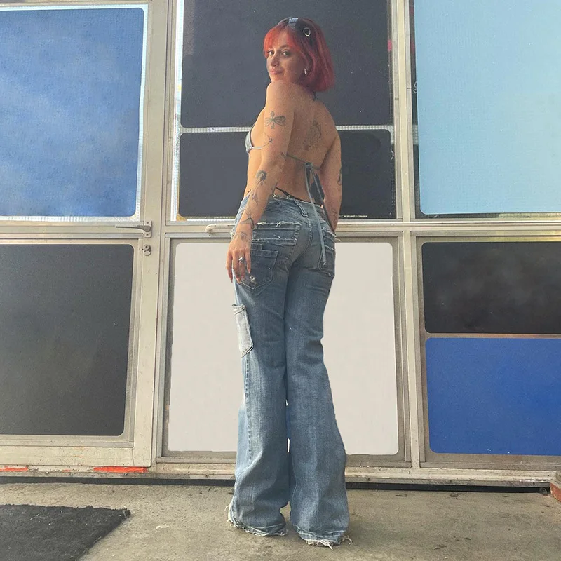 Female Star Patterns High Waist Long Straight-Leg Cargo Jeans with Pockets Y2K Baggy Streetwear Woman Pants Harajuku Wide Leg