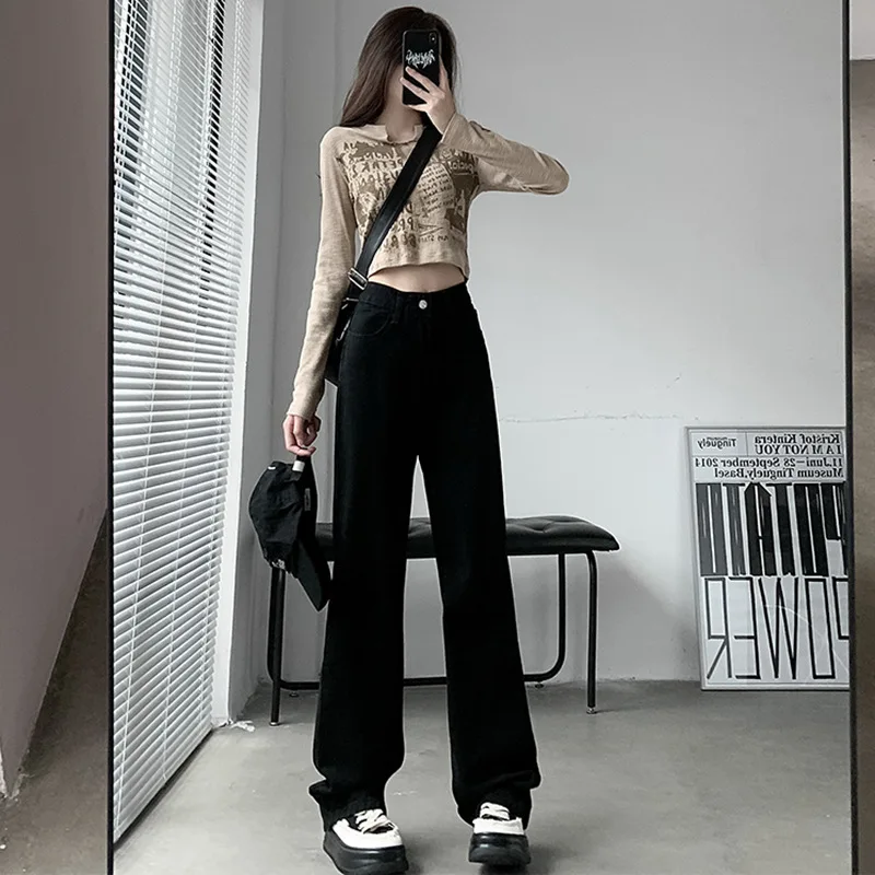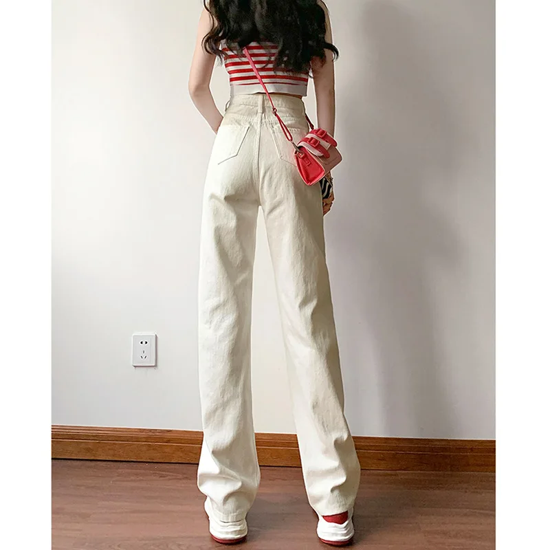 Korean Style Denim Wide Leg Pants Women Empire Waist Straight Loose Full Length Jeans Fashion Vintage All-matched Pants