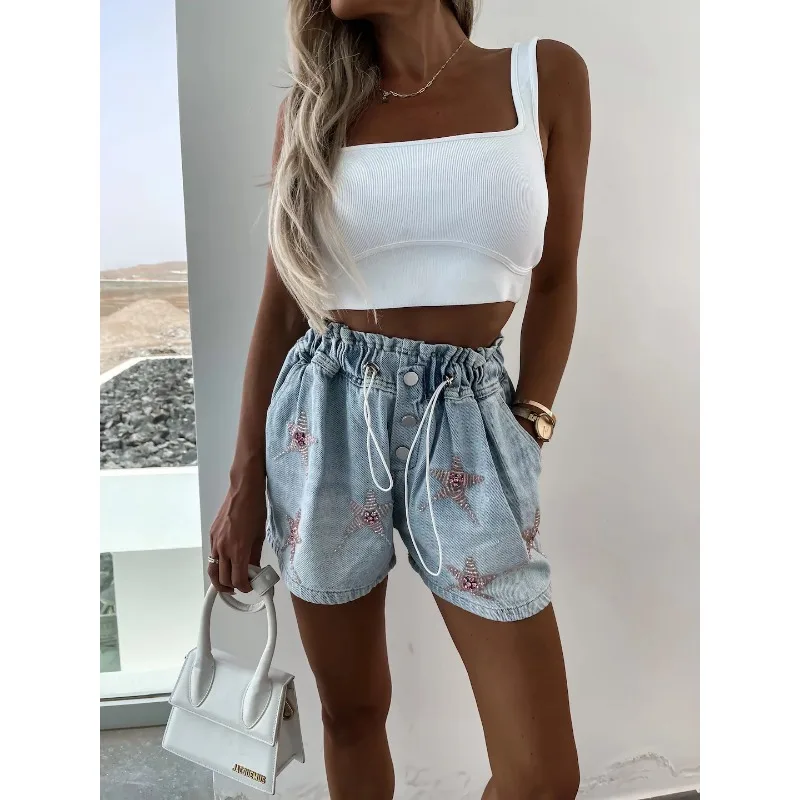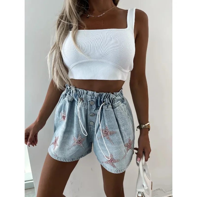 Rhinestone Short Jeans Elastic Waist Denim Shorts Straight Y2K Fashion Streetwear Short Jeans Women Summer Leisure Short Jeans