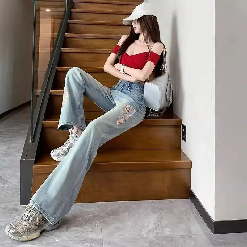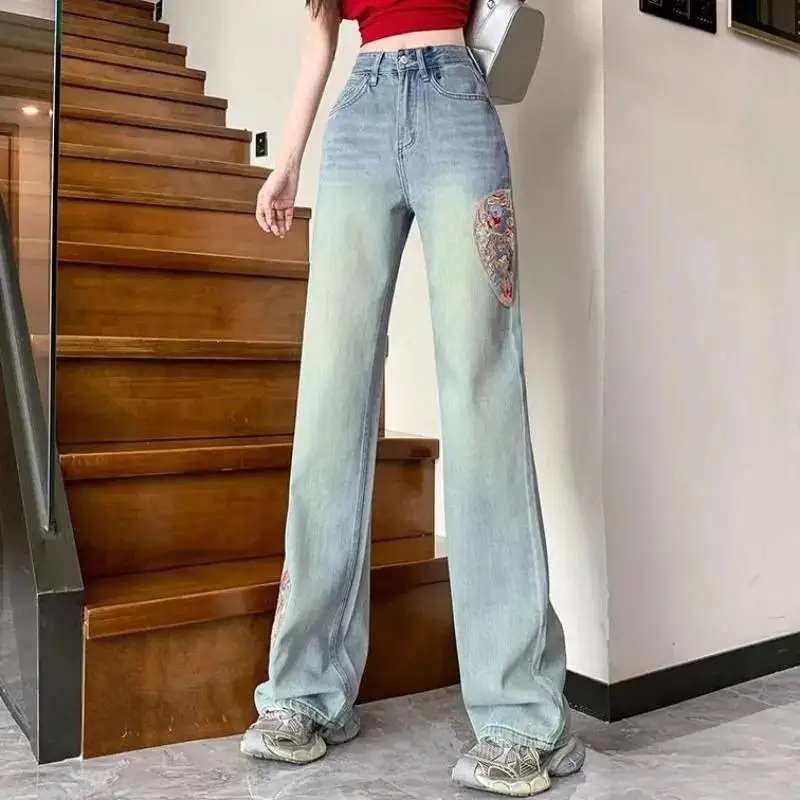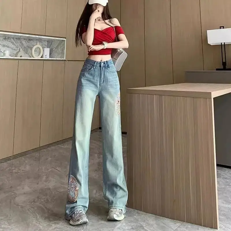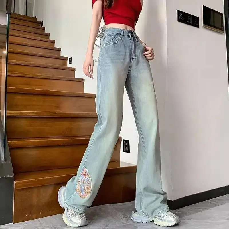 Name | Embroidered High Waisted Jeans for Women 2024 Spring New Loose Straight Leg Pants for Women Blue Washed Jeans |