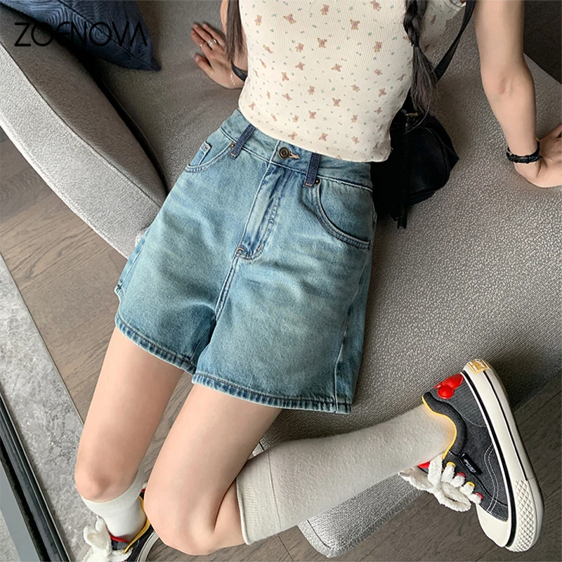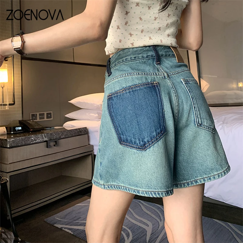 ZOENOVA Retro Blue Contrast Design Women's Jeans Summer Fashion Cool Girls A-Line High Waist Straight Casual Denim Y2K Shorts