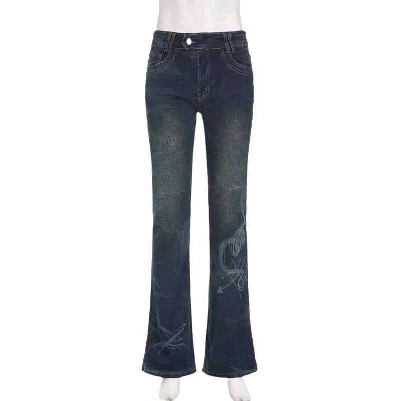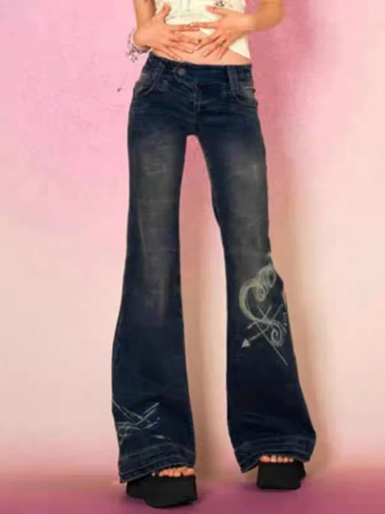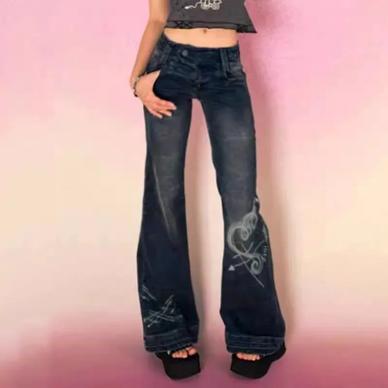 Women Jeans Print Distressed Denim Wide Leg Pants Spliced Pockets Low Waist Sexy Washing Zipper Fly Winter High Street Loose