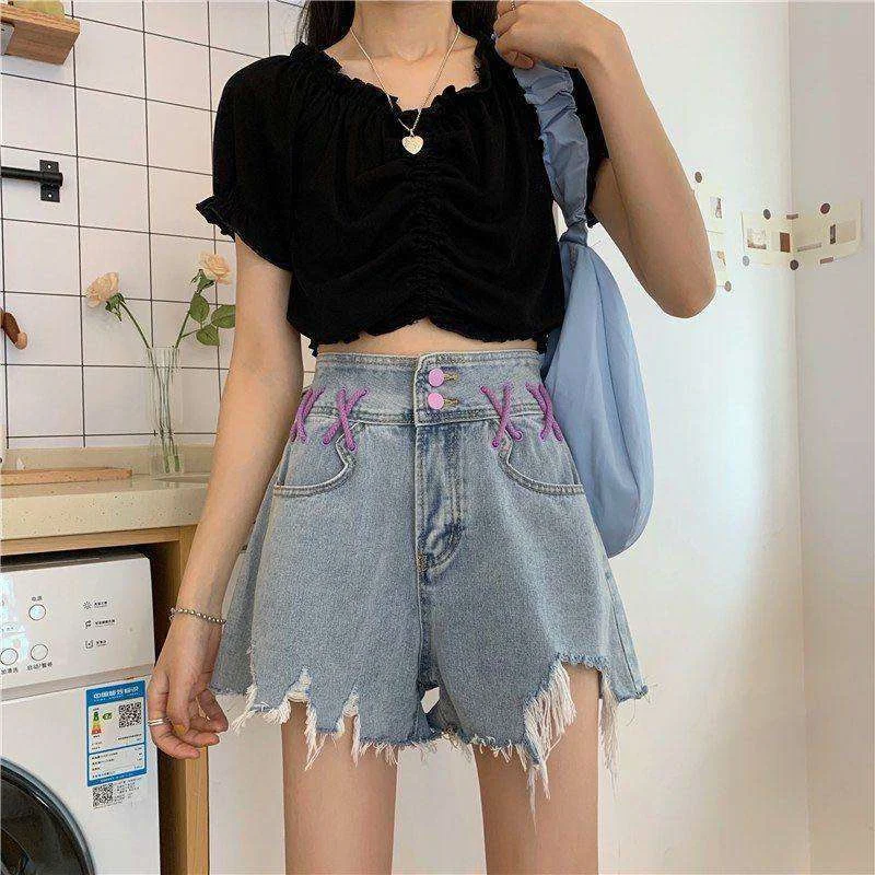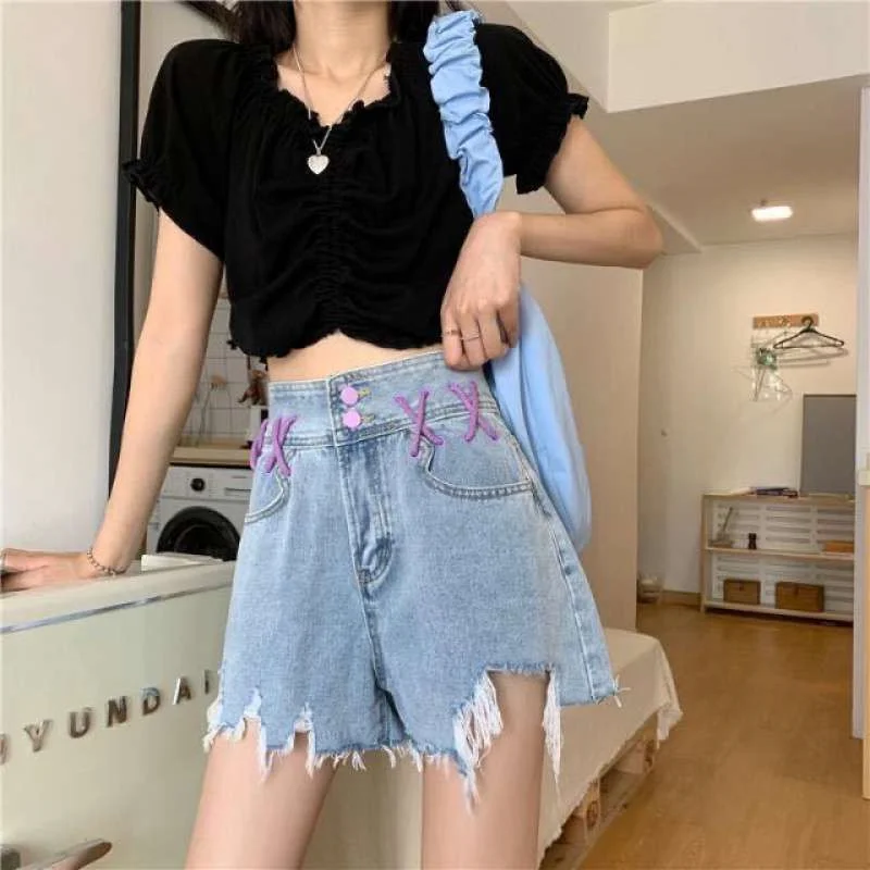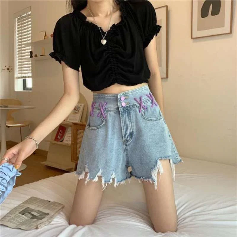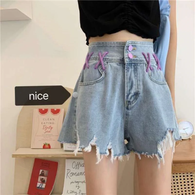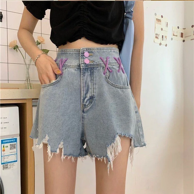 Shorts Women Summer Distressed Pockets Fashion All-match Denim Simple Female High Waist Chic Loose-fitting Design Button