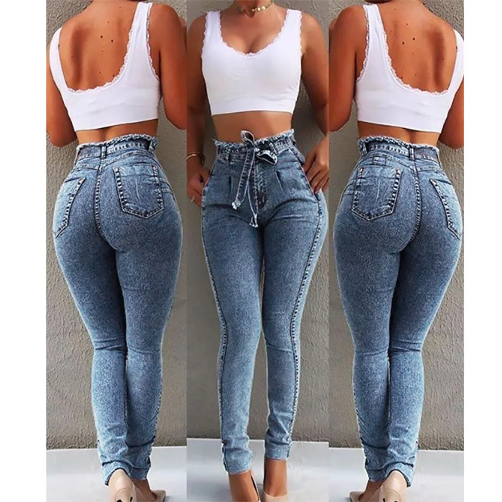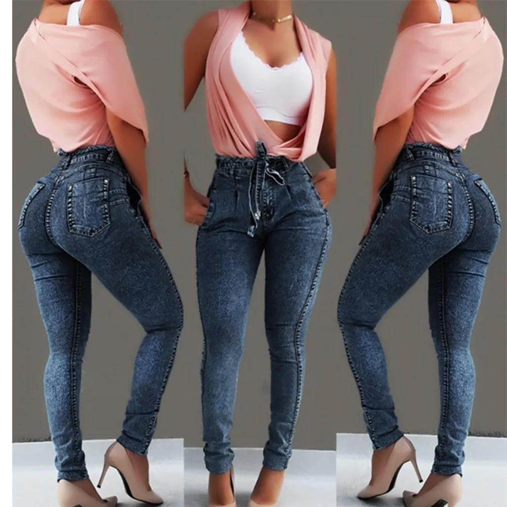 Name | Women Jeans Elastic Waist Solid Color Pencil Pants Pockets Streetwear Casual Slim Fit High Street Flat Zipper 2024 Summer |